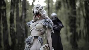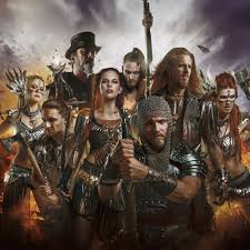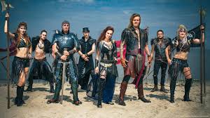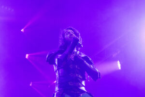 Des “guerrières” sont positionnées sur les côtés de la scène, avec bouclier et hache et portant des peaux de bêtes. Le pied de micro est décoré d’une épée