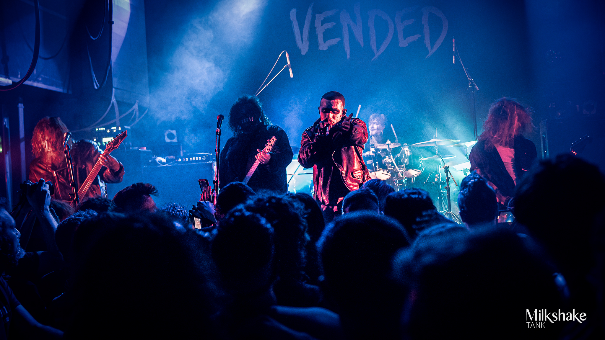 Enfin, Vended monte sur scène, déclenchant une vague de cris enthousiastes. Leur set démarre avec le titre “Nihilism” qui met de suite tout le monde d’accord et ça Moshpits dès les premières secondes! Sur le titre “Am I The Only One“, Griffin hurle « bougez vous dans le pit, on veut savoir à quel point vous êtes fou à Paris » évidemment le public s’exécute en une fraction de seconde! Avant de démarrer Burn My Misery, Cole (guitariste) cri à ses compères que « bordel il fait super chaud ici » et effet c’est vrai que putain, le plafond et les murs dégoulinent tellement la chaleur est étouffante et que tous transpirent! A la fin de ce morceau la fosse jump dans tous les sens, à tel point que je le sens moyen rassurer de sentir la péniche gigoter autant!!! Avant de débuter “Where The Honesty Lies“, Griffin se met torse nu, à cause de cette foutu chaleur, ses peintures de guerriers ont quasi toutes disparu à cause de la transpiration, mais c’est pas ça qui l’empêche de nous envoyer à la tronche des growl de guerrier! Ce set est une déferlante de puissance, avec Connor au sommet de son art malgré sa pêche infructueuse.