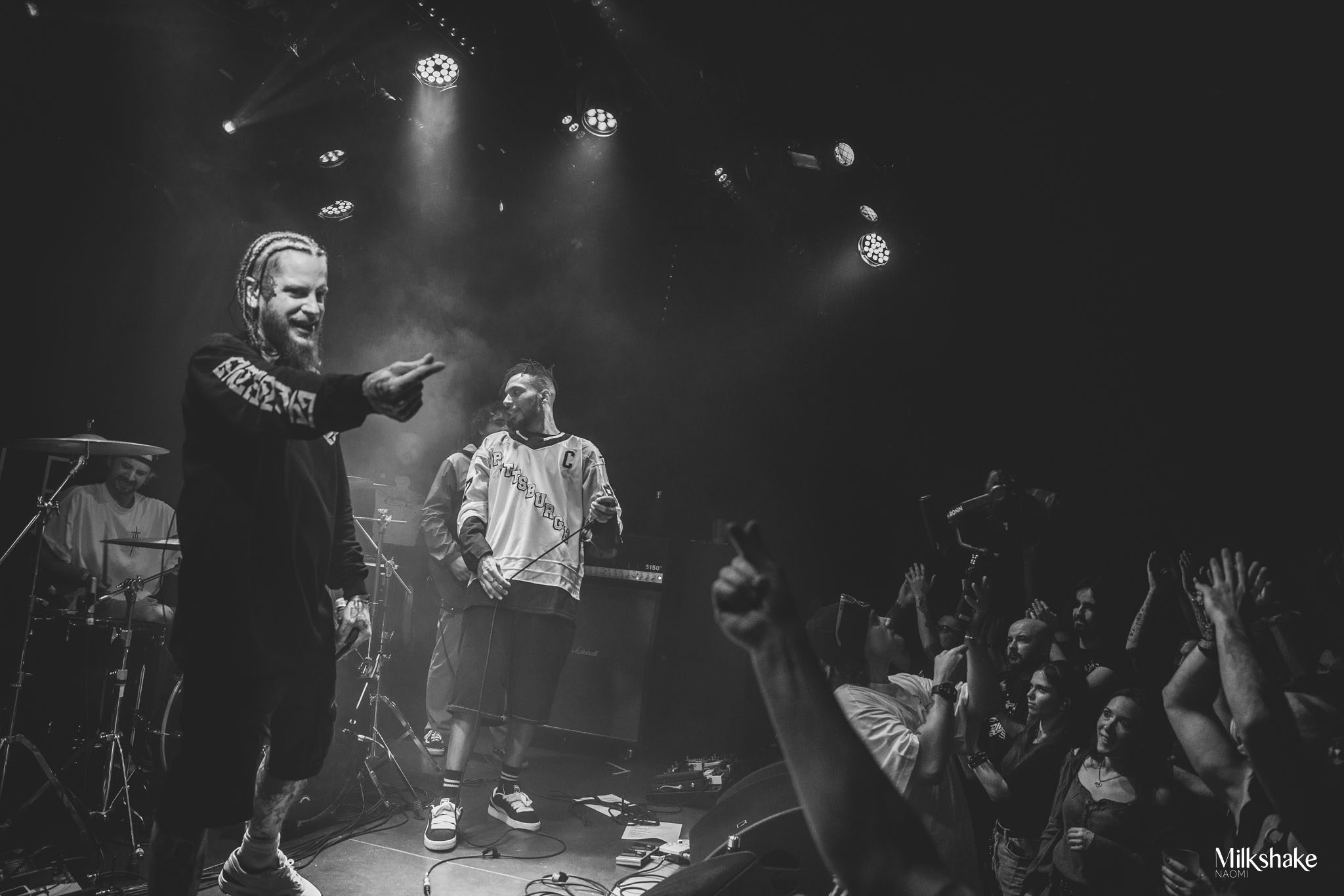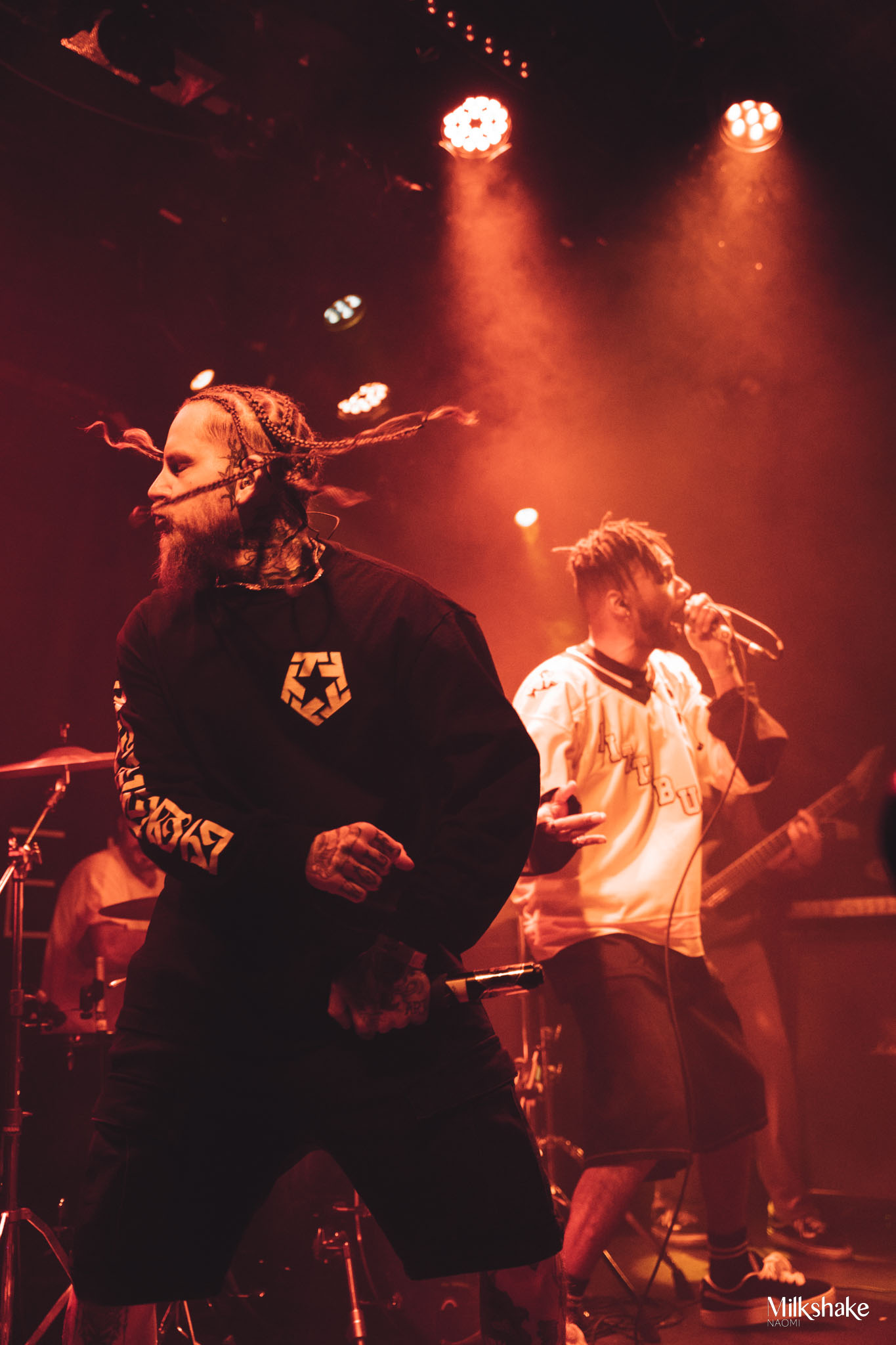 Ils nous balancent à la gueule le titre « The Rising » d’entrée de jeu, de quoi mettre une grosse baffe dès le début. Je me demande comment John fait pour reprendre son souffle entre ses hurlements bestiaux avec la bouche masquée. Et je comprend que ça ne doit pas être évident car au deuxième titre, ils finissent à visage découvert, ce qui n’enlève rien en termes de charisme à ces bonhommes! Il ne faut pas longtemps au public pour démarrer un moshpit aussi grand que la salle. Sur le titre « My Fate » on atteint l’apothéose de la brutalité. Tout le monde est déchaîné tant sur scène que dans la fosse.