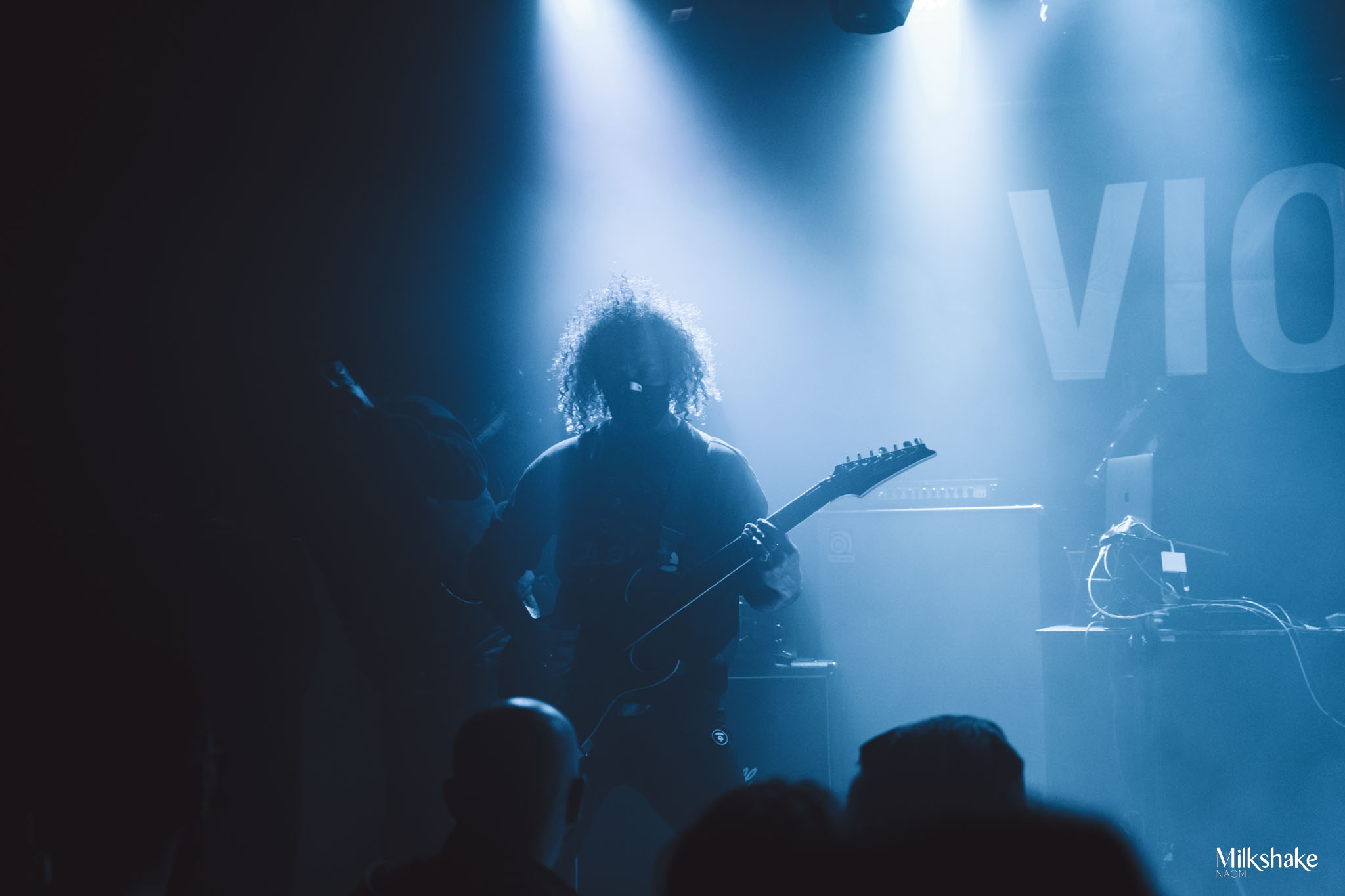 Violence se prépare à monter sur scène. John (chant lead) arrivé il y a peu, est briefé par le reste du groupe, Fred (machine & chant), Fabio (guitare) et Morgan (batterie) sur la salle, la scène etc. En effet il n’a pas pu se libérer plus tôt de ses obligations professionnelles. Donc pas le temps de souffler il va devoir se jeter dans le bain rapidement et faire ses balances tout aussi rapidement.