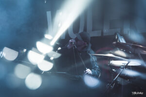 Violence gets ready to go on stage. John (lead vocals), who arrived a short time ago, is briefed by the rest of the band, Fred (machine & vocals), Fabio (guitar) and Morgan (drums) on the venue, the stage etc. Indeed, he couldn’t get away early from his professional obligations. So there’s no time to breathe, he’s going to have to get into the swing of things quickly and do his sound check just as quickly.