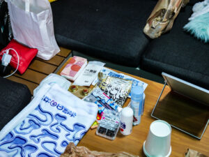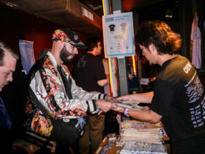 VIPs are the first to walk in, each handed a swag bag with a signed poster, a cup, a tote bag, and a souvenir laminate. Eyes light up, wallets open wide, the merch table is already getting swarmed.