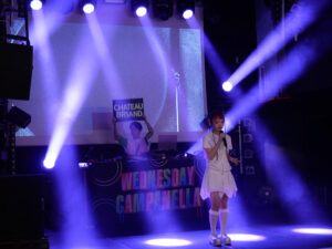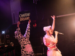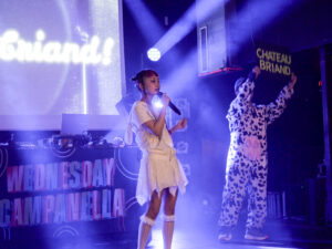 Between songs, Wednesday Campanella shares her food discoveries in France (croissants, macarons), while her DJ gushes about steak and escargots. Laughter rolls across the venue.
