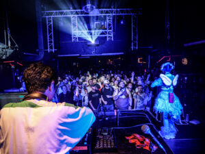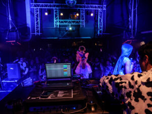 The screen behind flashes the title in sync with a spinning steak. The DJ raises a sign, and mid-song, quietly slips into… a full cow costume.