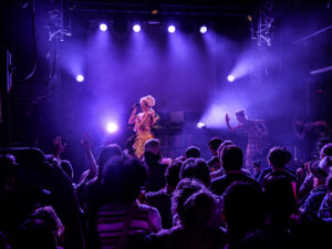 À 20h50, le DJ de Wednesday Campanella monte sur scène, acclamé par un public déjà chaud… et voilà la chanteuse qui surgit du fond de la salle, se frayant un chemin parmi les spectateurs pour atteindre la scène. Effet garanti : la fosse explose de joie.