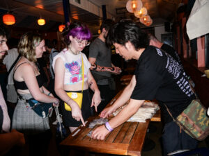 The merch booth, completely overrun by fans, ends up being moved upstairs to handle the crowd.