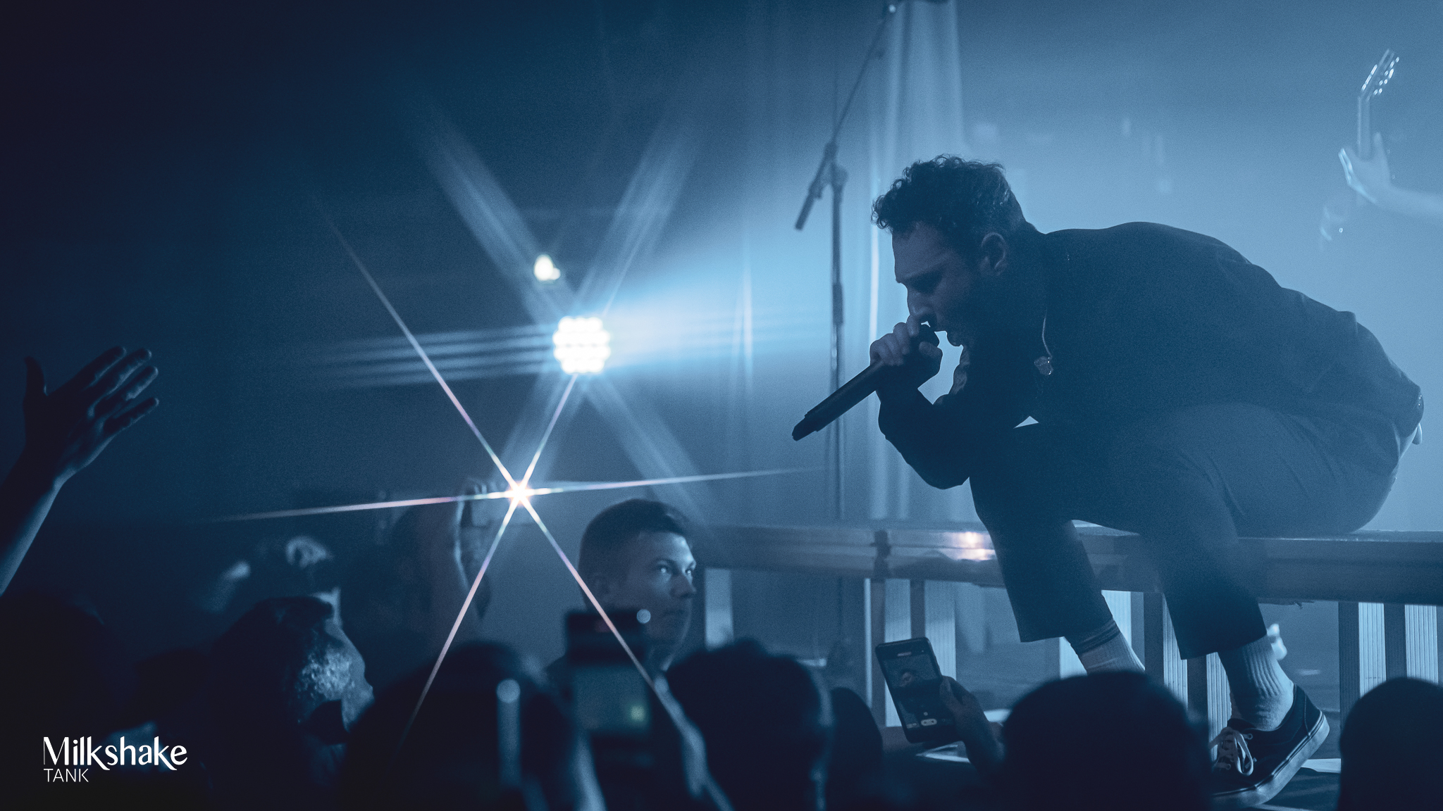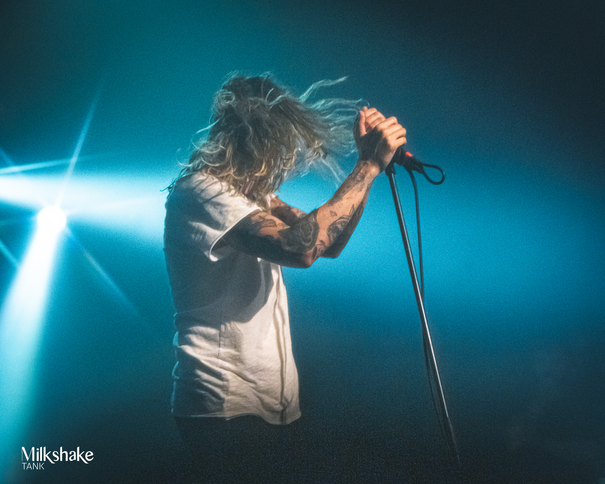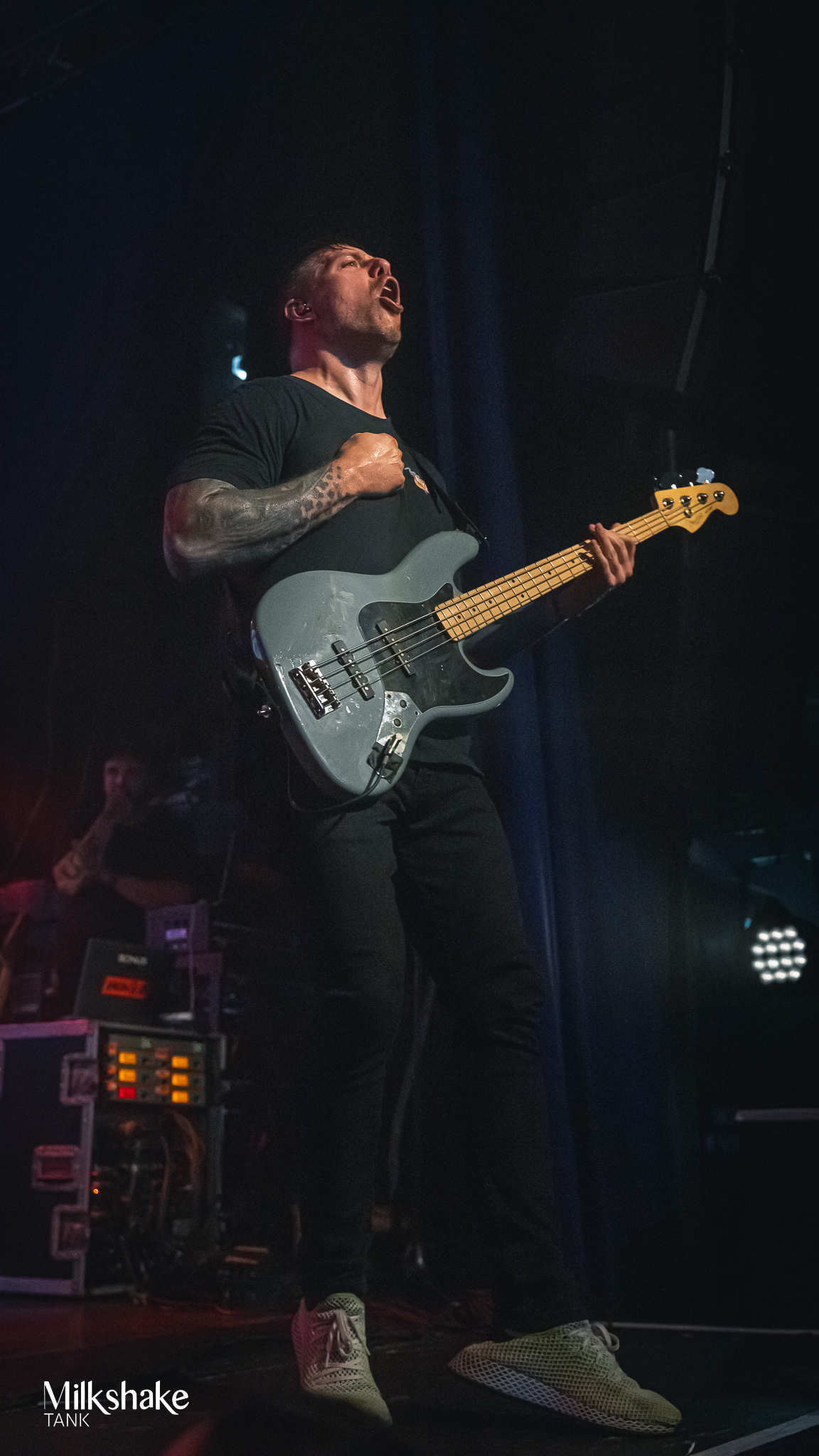 The lights go down and Resolve enter the stage with a vengeance. Anthony Diliberto (vocals), Antonin Carré (guitar), Robin Mariat (bass) and Nathan Mariat (drums) greet the crowd, arms raised. The set begins with ‘Human‘, instantly awakening the crowd, who start headbanging frenetically. Vocalist Anthony expresses the honor of opening for Underoath, a band they’ve been listening to since they were kids. “I guess you do too,” he says to the crowd, who respond with roars of approval.