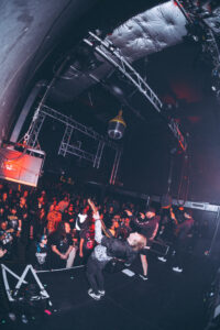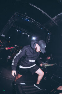 Le premier titre, Hiram, déclenche instantanément la fosse. Pas d’échauffement, pas de montée progressive : la violence commence tout de suite. Zek porte un t-shirt Latino Run Hardcore, clin d’œil parfait à la musique d’attente qui tournait avant le concert. Sur Frozen Vision, Zek prend déjà le contrôle total du public. Il invective la foule, demande de bouger, de séparer la fosse en deux. Évidemment, le public obéit immédiatement. Philosophical Research Society confirme que la salle est complètement acquise. Zek lance :
