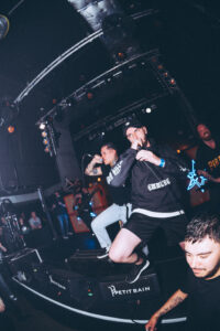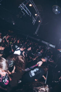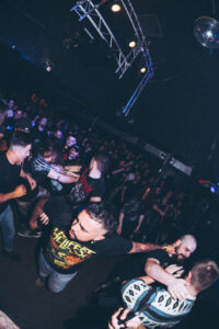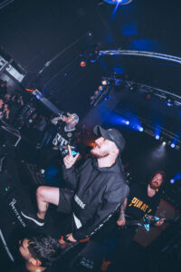 Puis arrive Freaks. L’énergie ne redescend pas, elle s’intensifie encore. Vincent de NDKH rejoint le groupe, puis Aaron de ten56 s’ajoute. La scène devient un champ de bataille. Sur Dialysis : circle pit massif. Puis Psychoactive Green Fairy. Longue intro, la pression monte lentement, puis tout explose. Premier crowdsurf. Zek finit par jeter le micro, foncer dans la fosse, lancer le moshpit le plus violent de la soirée, puis revenir sur scène en crowdsurf. Moment complètement fou. À la fin du morceau, il dit :