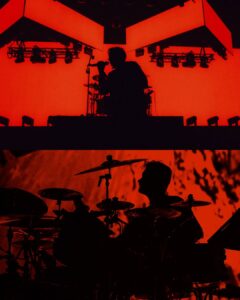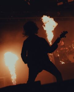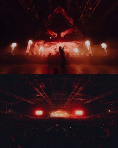 Quand les lumières s’éteignent après le changement de plateau, le silence qui s’installe n’est pas un simple silence. C’est une retenue collective, un souffle suspendu. Puis la lumière se rallume et révèle une scénographie qui surprend : un haut de scène pyramidal, des écrans monumentaux, des lignes de feux maîtrisées, comme si chaque élément avait été calibré pour raconter quelque chose. Bad Omens entre, et le premier impact est visuel, presque cinématographique. Le groupe n’arrive pas pour jouer des chansons : il arrive pour faire exister un univers.