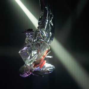 Après l’entracte, un autre numéro aérien marque les esprits : une table illuminée de bougies est placée au centre, tandis qu’une fanfare cagoulée entoure la scène, et une femme en tenue bleue transparente est portée dans les airs. Elle est placée sous la table, qui s’élève à son tour, et exécute un ballet aérien d’une poésie intense, chaque mouvement accentué par une musique qui semble suspendre le temps.