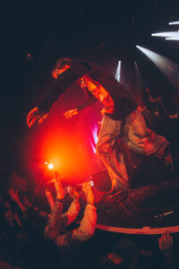 At one point he asks: “Who’s seen us before?” A lot of hands go up. For the next song, he tells the crowd to raise their hands… and drops a massive “FUCK THE…”. The rest disappears in a storm of screams and bodies flying through the air. The stage dives become completely out of control, some people are practically flipping, and one guy even spins on stage before launching himself into the crowd.