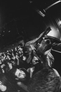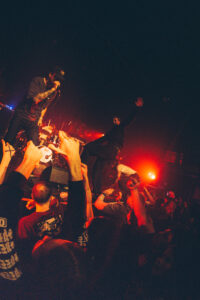 À un moment il demande : “Qui nous a déjà vus avant ?”. Beaucoup de mains se lèvent. Pour le morceau suivant, il demande au public de lever les mains… et balance un énorme “FUCK THE…”. La suite disparaît dans un déluge de cris et de corps qui volent. Les stage dives deviennent complètement incontrôlables, certains sautent presque en salto, et même un mec fait une pirouette sur scène avant de plonger.