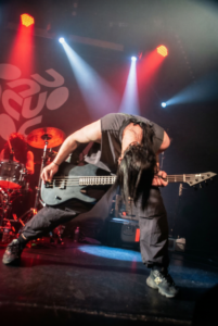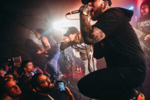 “Hail to the Hellfire” sert à présenter le groupe mais surtout à réclamer encore plus d’énergie (comme si c’était possible), jump général, puis wall of death massif. “Six Feet Under” arrive et là le chanteur encourage les stage dives… mauvaise idée (ou excellente), ça devient le chaos total, au point qu’un guitariste finit carrément sur la table de merch sur le côté.