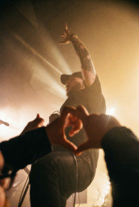 “Watch Me Burn” brings a surprisingly emotional moment, a wave of heart hands in the pit, the singer saying “you are the soul of this band”… and then right back into massive jumping. “Apollo” signals the end is near… so of course, the pit goes even more out of control. The vocalist crouched at the center, the band circling him, and the crowd crashing into each other from every direction.