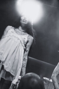 The tracks from And You Who Drowned in the Grief of a Golden Thing build this thick, almost hypnotic atmosphere. It pulls you in like a slow spiral. At moments, the room goes nearly silent, completely locked in. Then she cracks that darkness with a quick joke, especially when she shares that Devotion is her dog’s favorite song because he howls every time it plays. A small, funny break that lightens the mood and shows a different side of her.