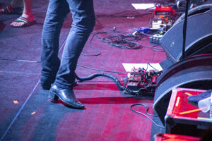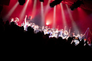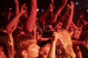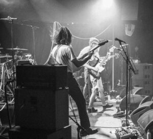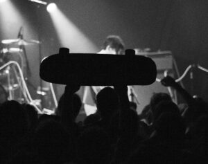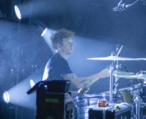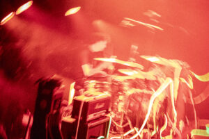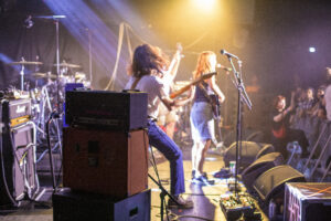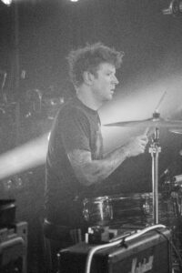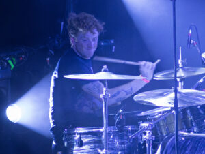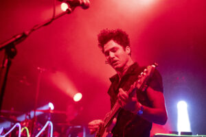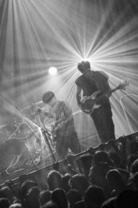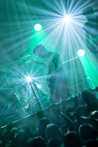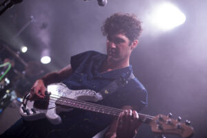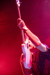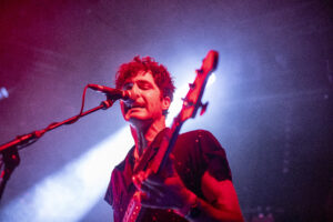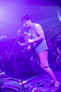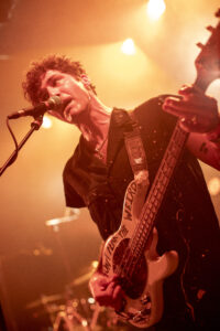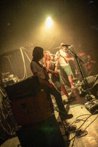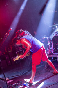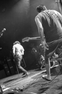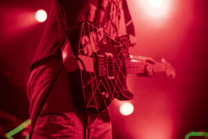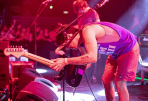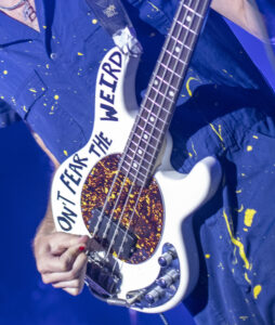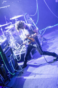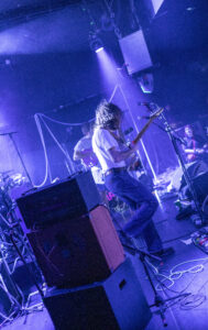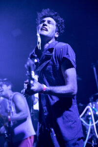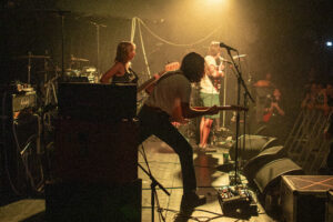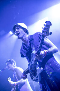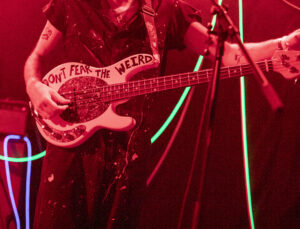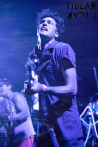 Le chanteur (et guitariste rythmique) Zac Carper, tout en étant en claquettes/chaussettes n’oublie pas de rappeler au public de “stay safe” (prendre soin d’eux). L’ambiance est bel et bien lancée, rythmée par le son bien punk de Fidlar qui fait plaisir. Cela se ressent dans toute la salle du Trabendo quasiment remplie. Une grosse partie de la fosse fait des pogos et s’agite au rythme des guitares et de la batterie. Les gens montent sur scène, sautent faire des slams, dansent sur scène. Chaque son ajoute une nouvelle touche à l’ambiance du concert. L’ambiance punk est dans la continuité et un rappel aux concerts de Scowl ou encore Turnstile. Le bassiste, Brandon Schwartzel, aura écrit au gaffeur sur son instrument “don’t fear the weird” (ne craint pas l’étrange) tandis que Zac (chanteur) aura une guitare noire avec des toiles d’araignées, so emo.