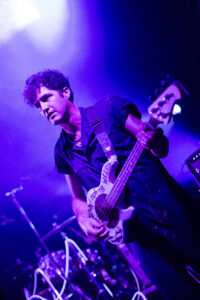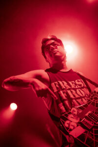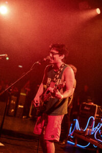 Frontman (and rhythm guitarist) Zac Carper, rocking socks and slides, of course, didn’t forget to remind the crowd to “stay safe.” By then, the vibe was fully locked in, driven by FIDLAR’s signature no-bullshit punk energy. You could feel it pulsing through the near-sold-out Trabendo. The pit was wild, kids moshing, crowd-surfing, dancing on stage. Every track cranked the energy higher. It felt like a continuation of the punk chaos you’d find at a Scowl or Turnstile show. Bassist Brandon Schwartzel had “don’t fear the weird” duct-taped to his instrument, while Zac rocked a black guitar decked out in spiderwebs, pure emo vibes.