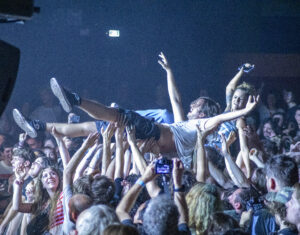 Il fait chaud, le public est heureux, Fidlar également, l’échange entre les deux est remarquable. Les bières volent partout dans la salle. Zac exige que le public fasse de la place dans la fosse afin de faire un moshpit juste pour les femmes (tout comme Frank Carter & The Rattlesnakes ont pu le faire lors de leur concerts). Zac glisse même cette phrase : “If you see a dude, fuck him!” (Si tu veux un mec, emmerde-le !). Les sons s’enchaînent, Sober, Centipede, I just wanna die, pour enfin finir (avant le rappel) sur Punks et Cocaine. Un enchaînement de titres assez cocasses pendant que quelqu’un brandit son vinyle en l’air dans la fosse sans avoir aucune crainte de le casser. C’est entre le dernier morceau (Cocaine) avant le rappel que l’on entendra aussi l’hymne anti fasciste raisonner dans la salle du Trabendo. Fidlar remonteront sur scène avec “Chinese Weed” pour enchaîner avec leur son “Wake Bake Skate”, extrait de leur album éponyme de 2013. Le public déchaîné fini par être encore plus fou. Une partie monte sur scène danser avec le groupe. Le dernier son est un gros bordel avant la fin du concert. Une fin digne d’un concert punk tel qu’on l’entends.