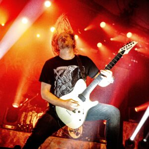The Halo Effect est le troisième groupe à monter sur scène et une nouvelle fois, le contraste est immédiat. Après deux formations qui ont passé la soirée à nous rouler dessus, leur arrivée fait presque l’effet d’une pause… enfin, une pause version Göteborg, donc avec des guitares qui pleurent des mélodies mais toujours assez de double pédale pour décoller le parquet de l’Élysée Montmartre.