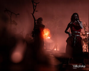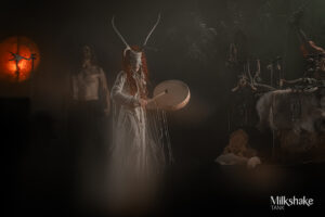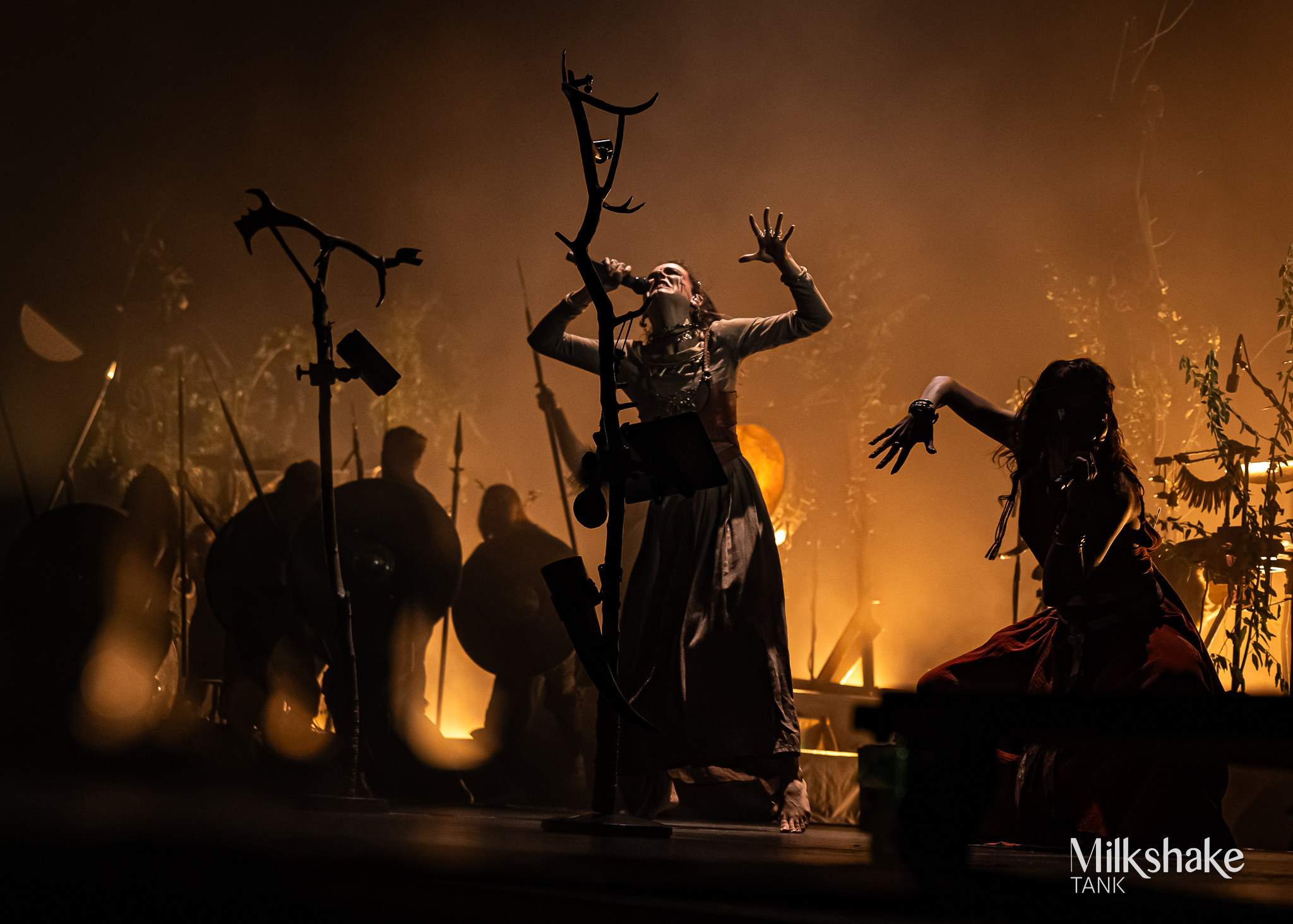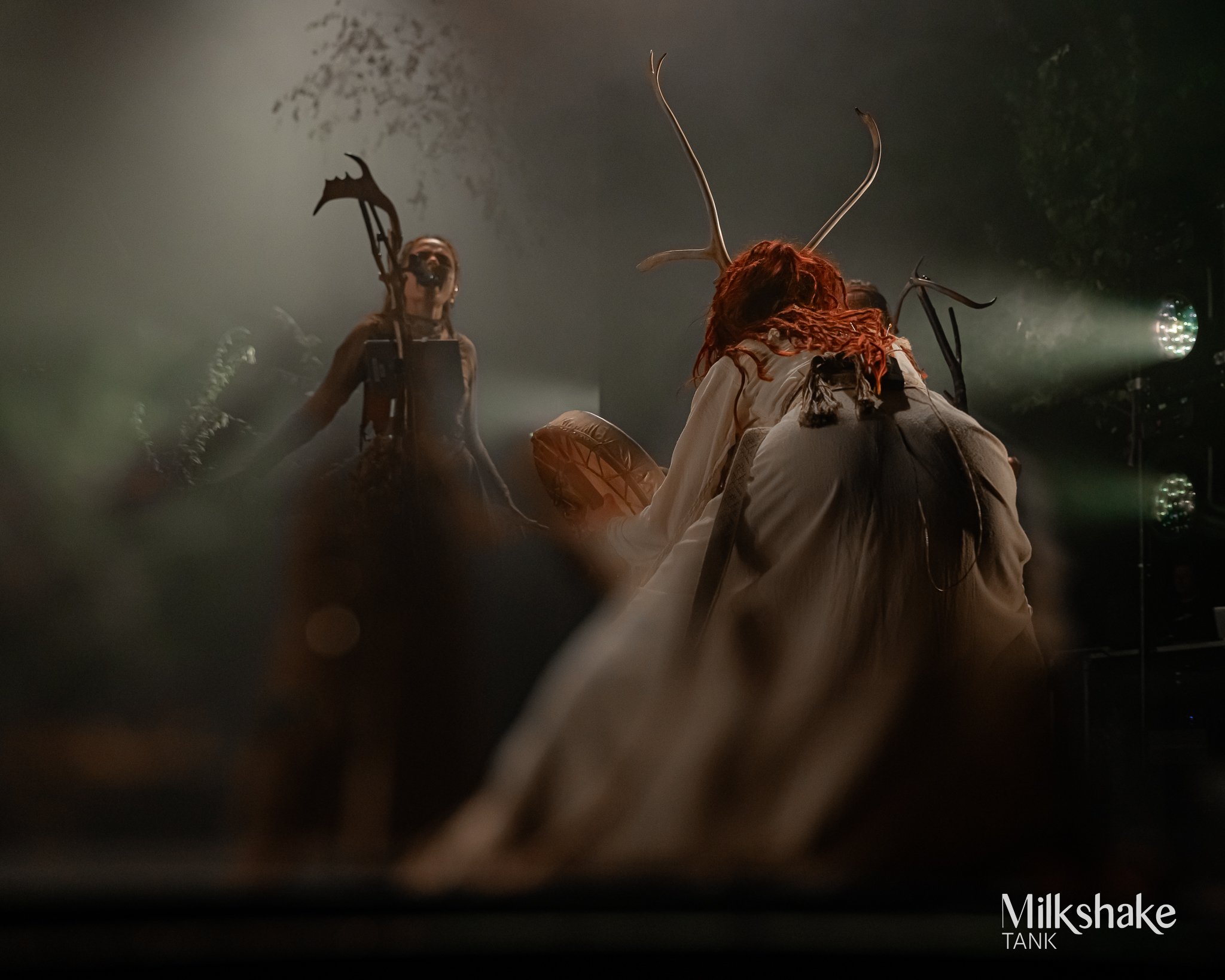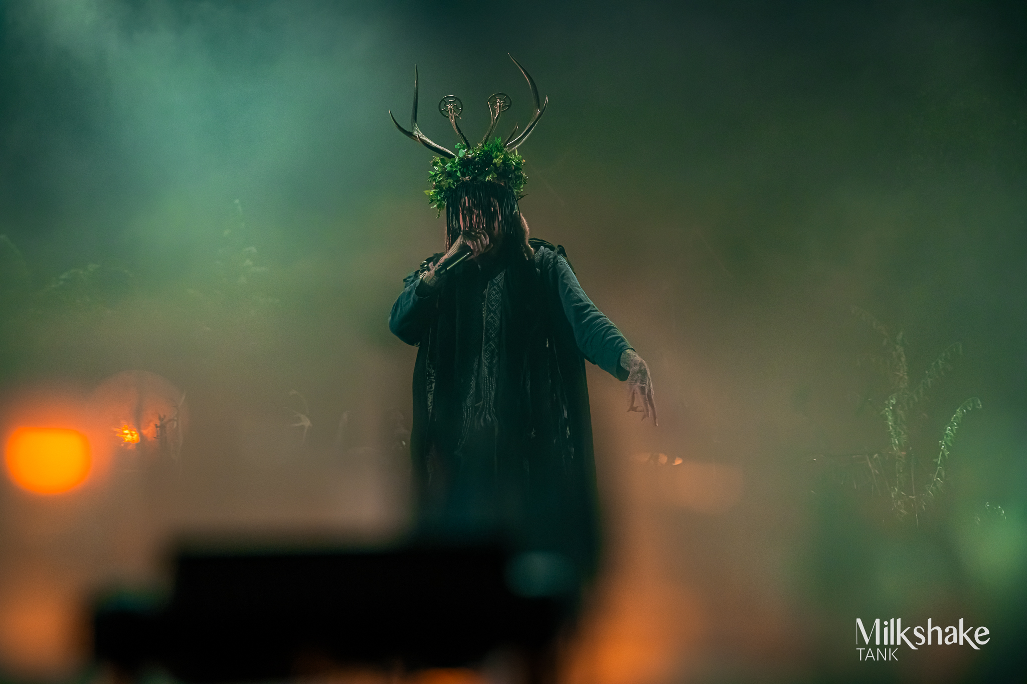 La transition vers Heilung est immédiate, mais le contraste est frappant. Quand la scène se dévoile enfin, un décor de cérémonie païenne prend place sous les hurlements du public. Christopher Juul entre et purifie la scène avec de la fumée, tandis que Maria Franz, telle une prêtresse mystique, s’avance en robe blanche, coiffée de bois de cerf, une lanterne à la main. À cet instant, c’est un véritable rituel qui commence, accompagné par les cris de loups imités par le public.