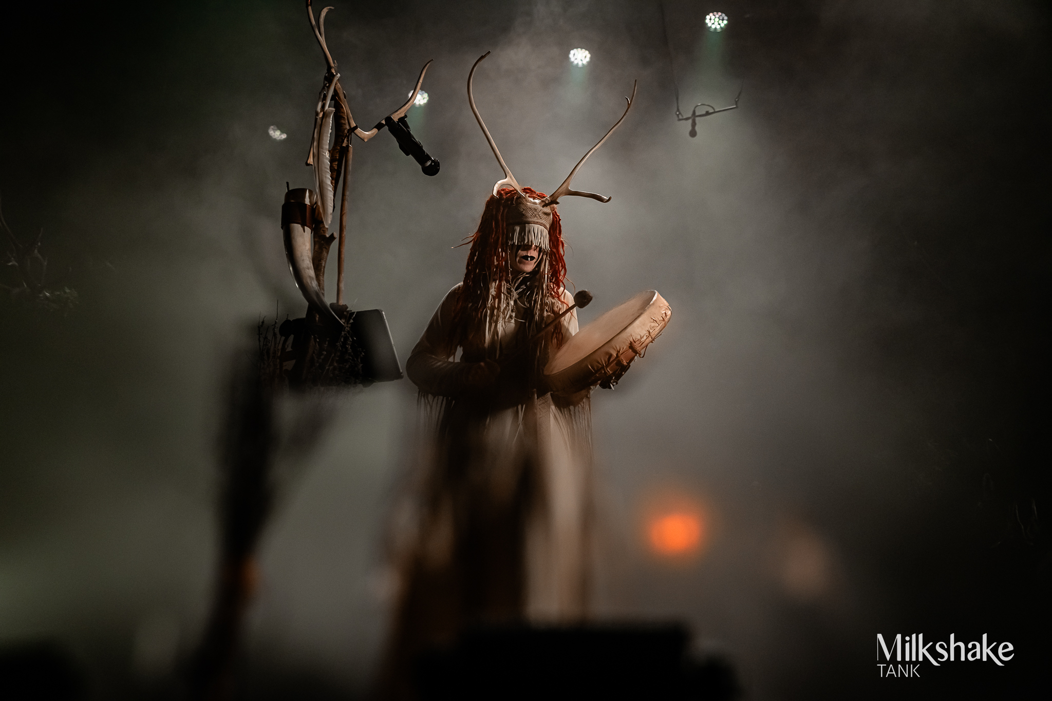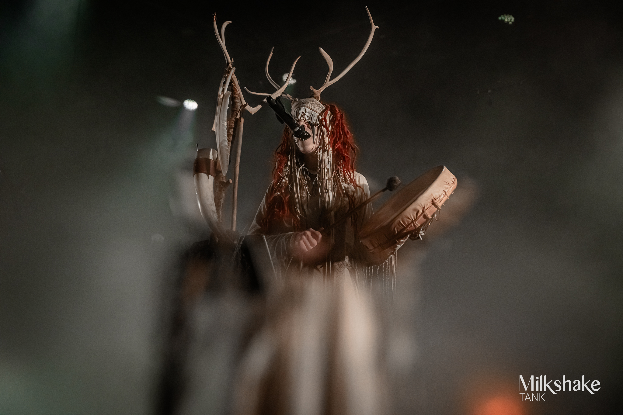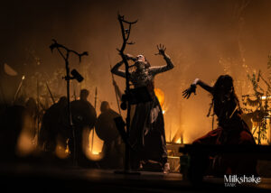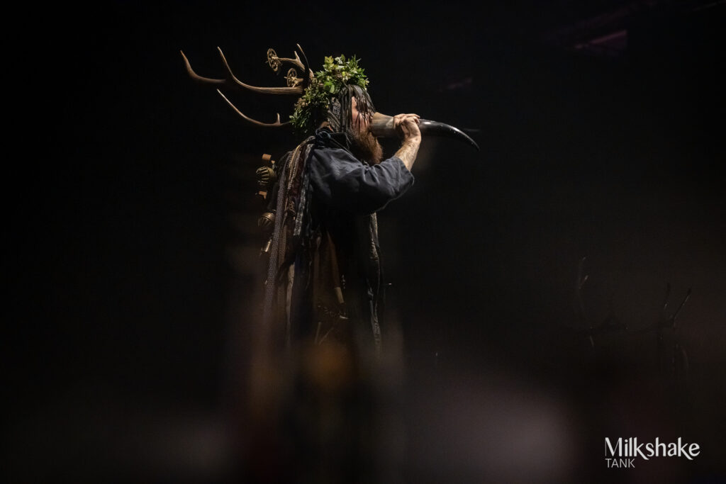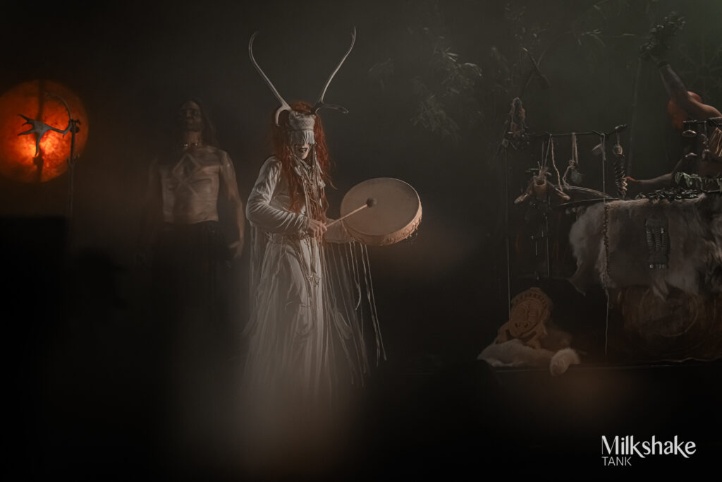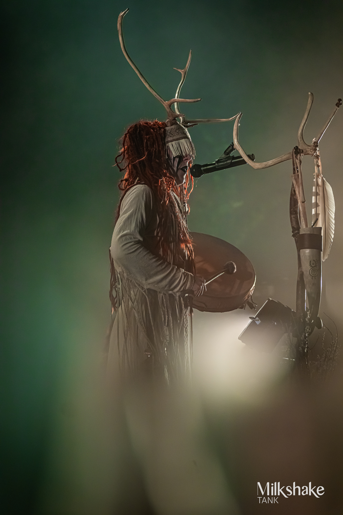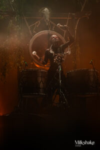 Le concert continue de nous plonger dans cet univers mystique, où des morceaux comme “Asja” et Hakkerskaldyr” nous enveloppent dans une ambiance cérémoniale. La mise en scène est minutieuse, chaque détail compte. Christopher Juul, devant ses guerriers, frappe un bâton orné de bois de cerf avec une force tribale, créant un lien entre les musiciens et le public, comme si nous participions tous à ce rite ancestral.