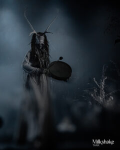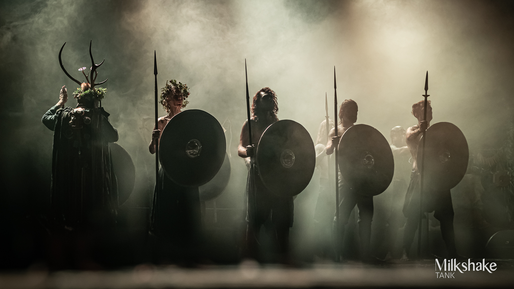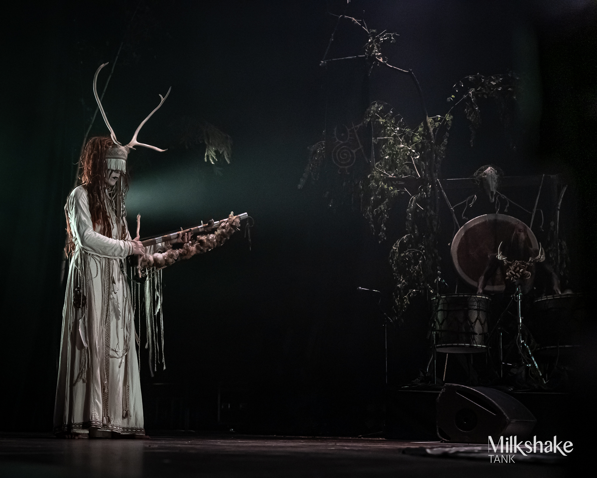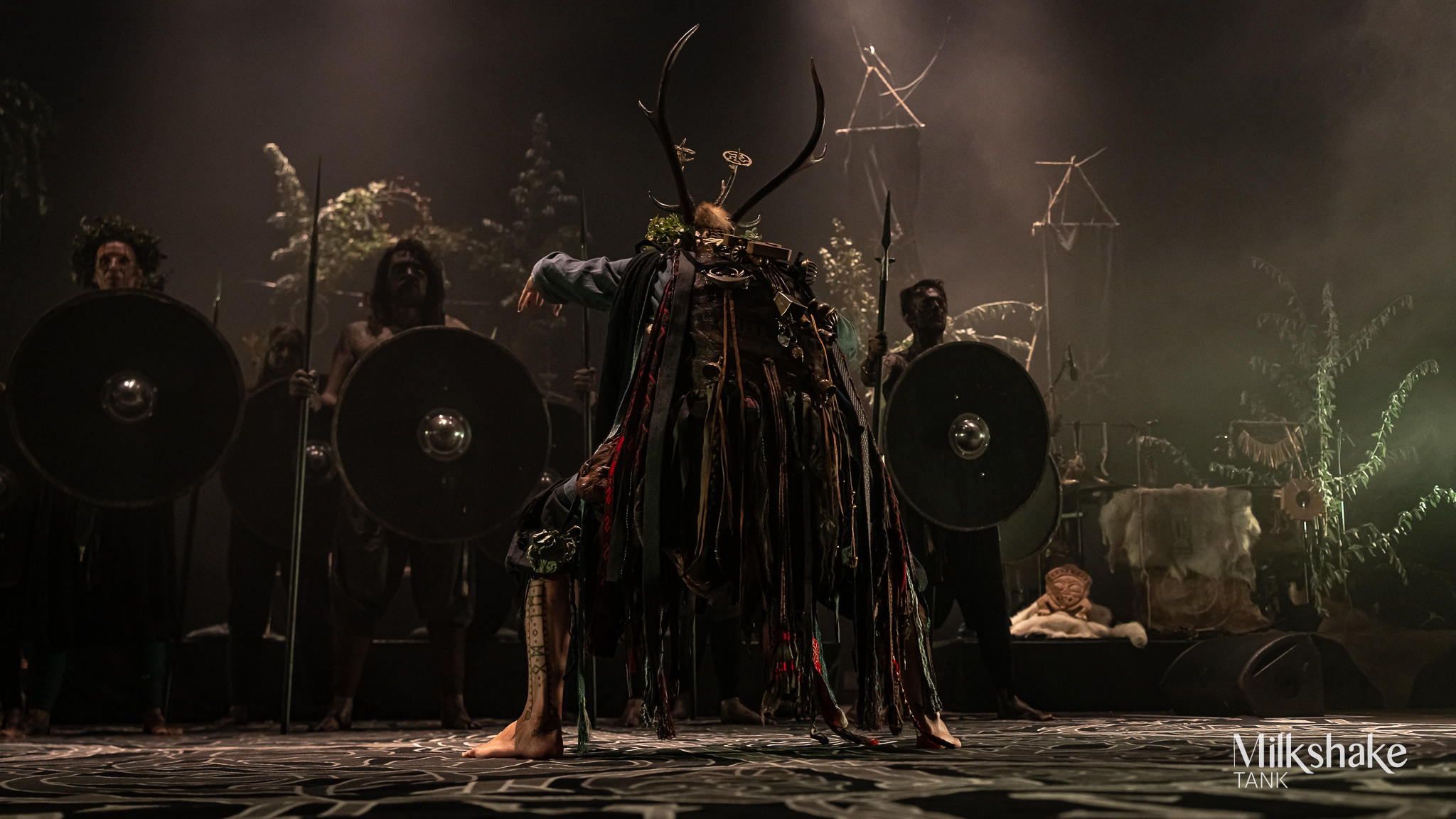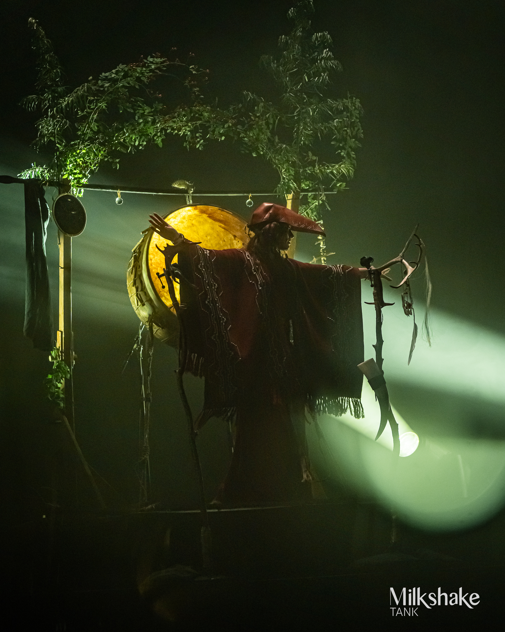 Le concert continue de nous plonger dans cet univers mystique, où des morceaux comme “Asja” et Hakkerskaldyr” nous enveloppent dans une ambiance cérémoniale. La mise en scène est minutieuse, chaque détail compte. Christopher Juul, devant ses guerriers, frappe un bâton orné de bois de cerf avec une force tribale, créant un lien entre les musiciens et le public, comme si nous participions tous à ce rite ancestral.