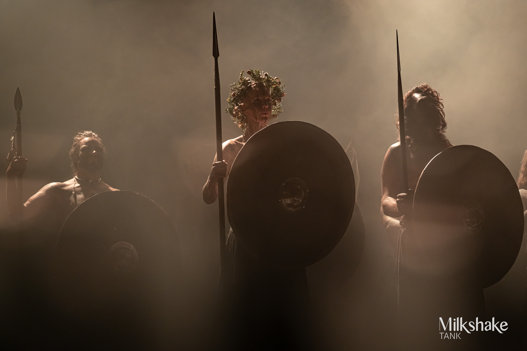 “Alfadhirhaiti” transporte le public dans une autre dimension. Kai Uwe Faust, vêtu tel un guerrier viking, lève une corne pour trinquer avec la foule, tandis que des bruits de corbeaux retentissent, plongeant la salle dans une atmosphère presque chamanique. Les choristes, fièrement postés en arrière-plan, lances et boucliers en main, ajoutent à cette scène guerrière. À ce moment-là, je me dis que si j’avais fumé un petit joint, j’aurais probablement été complètement transportée ailleurs !