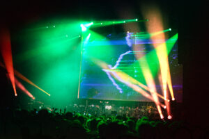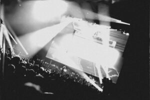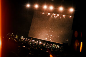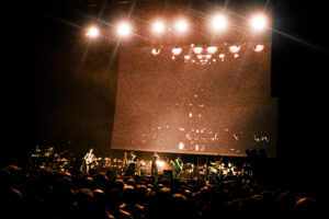 Alors que l’orchestre fait une pause d’une vingtaine de minutes, KGATLW restent sur scène. Pas de temps mort, pas de rappel. On passe à la deuxième partie du concert. La mise en scène, sobre avec l’orchestre, laisse place à des écrans et jeux de lumières explosifs, mêlés à des effets stroboscopiques.