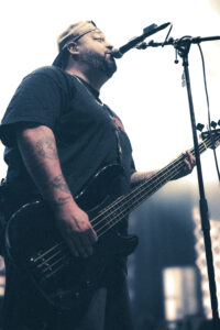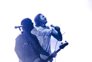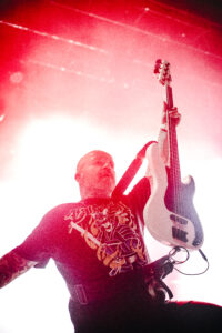 Puis Lionheart prend le contrôle malgré Rob encore sous grippe, Cali Stomp rend la fosse immédiatement hyper réactive et je dandine comme Jaja, Death Grip arrive avec un hands up lancé par le bassiste et des applaudissements en rythme, Burn enchaîne avec un feat express du chanteur de Slope, Trial By Fire déclenche un méga circle pit, When I Get Out voit les crowsurfs s’enchaîner, Vultures rappelle que le groupe a des nouvelles chansons à nous proposer, Bulletproof provoque un jump général, Live By The Gun est accueillie comme un titre que tout le monde adore, Lifer s’enchaîne sans laisser le temps de souffler ni de niaiser, Love Don’t Live Here démarre après une crampe bien vénère de Rob et pendant quelques secondes le bassiste anime la fosse avant que Rob demande si on veut entendre une ancienne et évidemment la salle hurle oui, Deathbed Confession arrive avec des jets de fumée sur scène et un moshpit en fosse, Roll Call devient un moment complètement fou quand le bassiste demande « y’a des filles ici ? », puis « y’a des hommes ici ? » et enfin « y’a des chiens ici ? » avant d’aboyer sous les cris du public, Born Feet First enchaîné à Break Stuff fait s’asseoir toute la fosse avant un jump continu sur tout le morceau avec un wall of death en plein milieu, Chewing Through the Leash est présentée comme une autre nouvelle chanson avec un put your hands up suivi d’un wall of death, Hail Mary est évidemment chantée par tout le monde, Death Comes in 3’s relance un circle pit, Fight For Your Right en cover des Beastie Boys voit le bassiste demander le plus de crowsurfers possible et LHHC conclut le set dans un énorme bordel en fosse quand tout le monde chante parce qu’évidemment on la connaît tous.