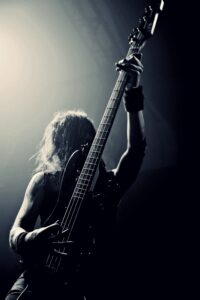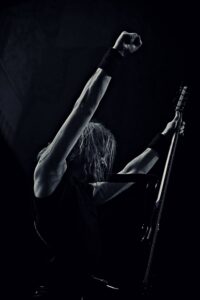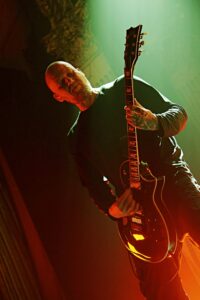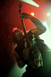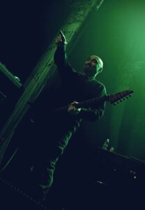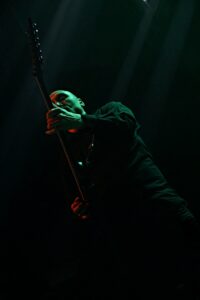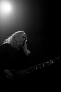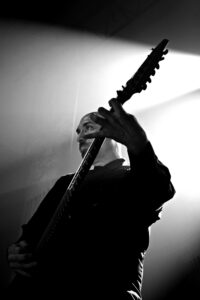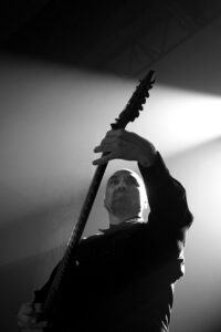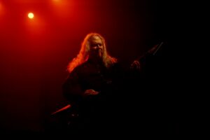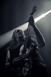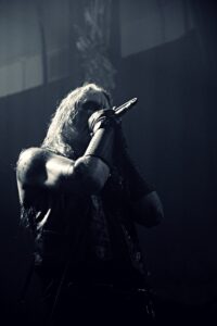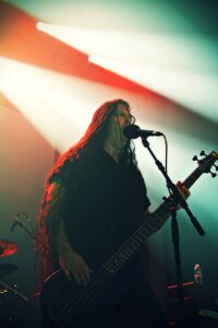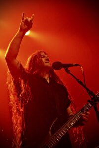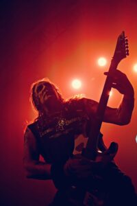Mortuus est bien trop bon chanteur pour s’époumoner n’importe comment. Il domine la scène avec des hurlements tranchants et une présence physique saisissante. Le premier rang en fait régulièrement l’expérience : des gouttes projetées par ses headbangings furieux, de l’eau, pas du sang… quoique, sûrement de la sueur à un moment donné. Son headbanging semble moins être un simple défouloir qu’un rituel pour entrer en transe : souvent penché en avant, visage caché entre le micro et sa chevelure, il paraît se couper du monde. Puis soudain, bras ouverts, regard planté dans la foule, il harangue les masses, tout en leur adressant parfois un signe complice, comme à des coéquipiers après un bon match, ponctuant le tout de vigoureux « Paris ! » pour chauffer la salle. Le guitariste Morgan Håkansson, lui, savoure visiblement la soirée. Grimaces, sourires tordus, il observe brièvement le public avant de brandir sa guitare d’un geste brusque. Fierté dans le regard, dents serrées, il défie la foule comme pour la provoquer à suivre le rythme.