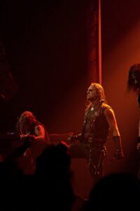 Mortuus is too good a vocalist to scream his lungs out in the bad way, and so he dominates the stage with attacking screeches and physical presence, which the first row regularly gets to feel through drips of water (not blood, but certainly sweat at some point) from his headbanging head. His “style” of headbanging seems to be less of an outlet of energy and more of a way for him to get into a certain state of mind, as he often remains bent down, hiding his face between mic and hair. When he stares into the crowd with open arms, he commands the masses but also nods to them like to team mates after a good game, now and then cheering them on with “Paris!” shouts. Guitarist Morgan HÂkansson enjoys his night with grimaces and twisted smiles. He briefly watches the audience, then suddenly yanks up his instrument, playing with pride in his face and challenging the crowd baring his teeth.