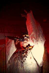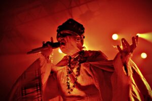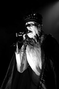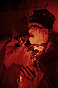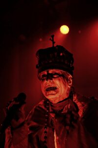 Ils surgissent avec le puissant « Realm of Endless Misery », tiré de leur nouveau necronomicon en huit titres, Liturgy of Death. Le groupe ne s’embarrasse d’aucun artifice vestimentaire, ils laissent cela au chanteur. Et quel spectacle : un pape sataniste vêtu de soie, tout droit sorti de la tombe, symboles occultes gravés dans les paumes, dents pourries aux lèvres. Un contraste total avec les jeans noirs et t-shirts sobres du reste du groupe.Permettez-moi une comparaison rapide : avec un groupe comme Ghost (qui a ses qualités) dans le paysage, et Mayhem sous mes yeux, j’ai l’impression de revenir aux racines, pas seulement du metal, mais, étrangement, d’une forme d’authenticité. Ici, costume et «masque » ne servent pas à dissimuler pour fabriquer un personnage (ce qui peut aussi avoir son intérêt). Ils semblent plutôt révéler ce qui bouillonne dessous. Sous le maquillage, on voit qu’Attila Csihar vit chaque mot. Chaque torsion de son visage, chaque mouvement serpentin de la langue, chaque geste minuscule donne chair à son incarnation. Ses pensées, aussi étrangères soient-elles, percent à travers des yeux réduits à de fines fentes.C’est peut-être là, dans ces fentes, que se niche la différence entre divertissement et art. Oui, c’est un show, mais cette performance paraît épurée, dense, presque intime depuis les premiers rangs, et donc sincère. « True »… ou « trve », pour ceux qui y tiennent. Le terme me fait lever les yeux au ciel, et le débat mérite d’être creusé, mais ce dont je suis témoin ce soir correspond parfaitement à ma définition personnelle du divertissement ET de l’art. L’auteur est peut-être mort, mais j’ai besoin d’un être humain face à moi qui cherche le lien. Csihar l’établit sans détour.
