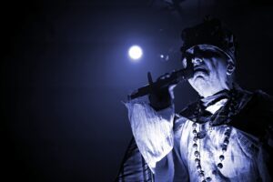 Bien sûr, l’aspect théâtral est tout simplement saisissant. Incarnation d’une folie de carnaval, violemment éclairé par une unique lumière au sol, le chanteur hongrois capte tous les regards. Les musiciens assurent brillamment leurs parties, mais entre leurs déplacements et leurs moments plus en retrait, c’est Csihar qui porte le spectacle à bout de bras. En un clin d’œil, changement de costume : le pape devient général, invoquant des armées venues des profondeurs ; puis sorcier, nous hypnotisant avec une corde qu’il fait tournoyer ou avec une guitare imaginaire. À ses côtés, toujours, un crâne, objet sacrificiel, trophée, confident auquel il chante… voire qu’il embrasse.En toile de fond, des images à la fois cauchemardesques et sublimes : ossements et cathédrales, forêts et tombes, flammes et portes closes, croix et ciels obscurs, fumée et corbeaux, lames de rasoir et sceau de Lucifer. Un décor qui parachève cette descente dans le neuvième cercle.