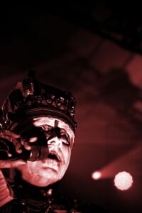 Of course, the theatrical aspect is also impressive as hell: As the embodiment of harlequinish madness, harshly lit from a single floor light, the Hungarian vocalist is the centre of attention. The band does a fantastic job playing their instruments, but with them either partying in their corner or walking up and down the stage, Csihar pretty much carries the entire show. With a quick costume change, the Pope becomes a general to invoke soldiers from the underworld, then a warlock hypnotising us with a swinging rope or his air guitar skills. His constant companion a skull to offer as a sacrifice or as a trophy, to sing to or even to snog. The background imagery to all of this is nightmarish and beautiful, with visuals of bones and cathedrals, forests and graves, fire and closed doors, crosses and skies, smoke and ravens, razors and Lucifer sigil.