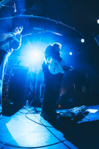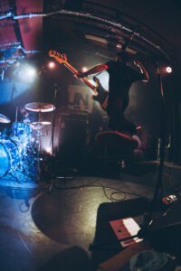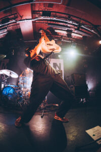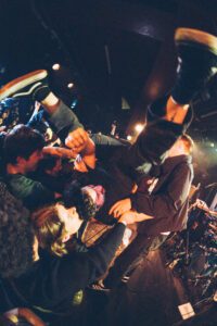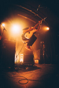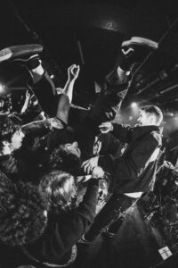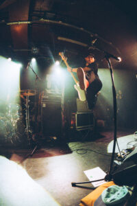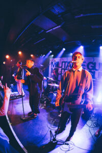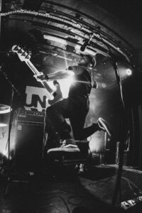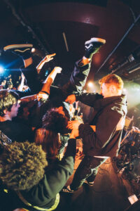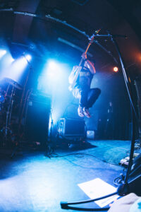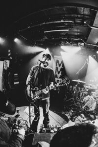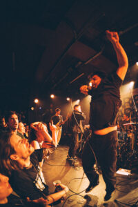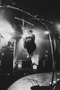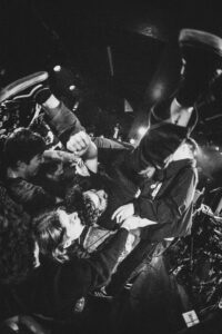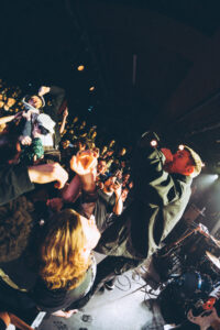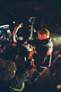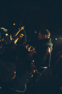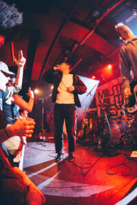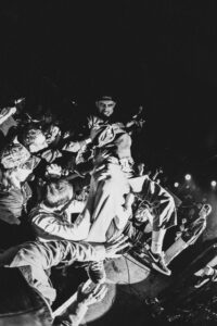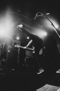 Ils savent. On sait. Quelque chose d’unique vient de se produire. Ian convainc les autres membres déjà en coulisses de revenir. Et la surprise : non pas un, mais deux morceaux supplémentaires. “Ain’t No Flowers”résonne avec encore plus de force. On donne ce qu’il nous reste. Puis vient “Do It Faster” . La scène devient un tableau vivant : corps en suspension, regards exaltés, voix éraillées, mains tendues. Chaque personne dans la salle semble faire partie d’une fresque collective. Le groupe savoure, le public s’abandonne. On pourrait presque figer l’instant, prendre du recul et se dire simplement : Voilà ce que c’est, un concert de Militarie Gun.