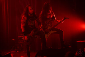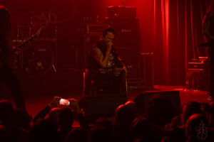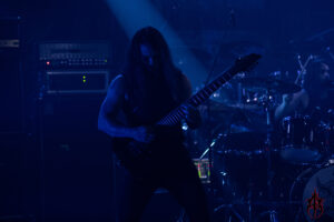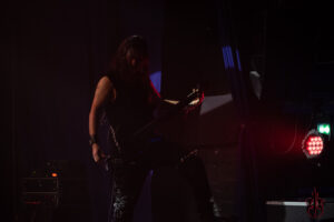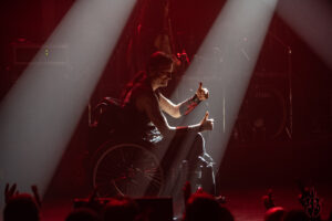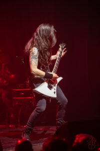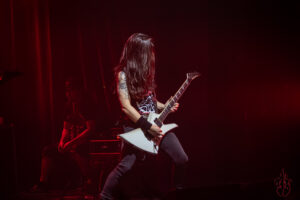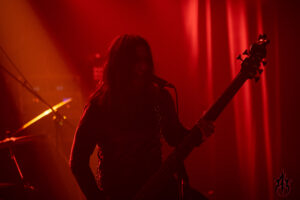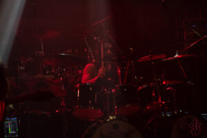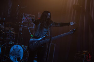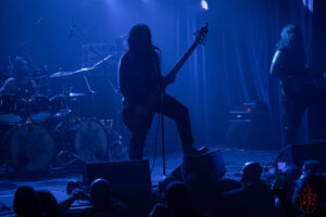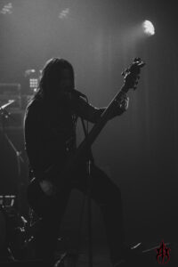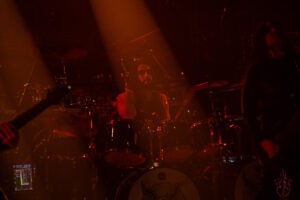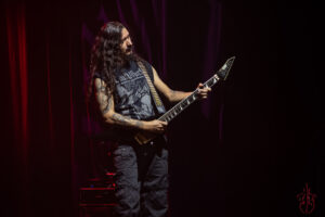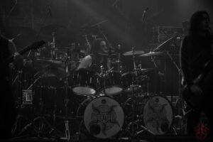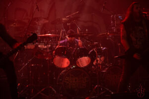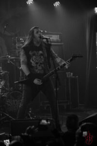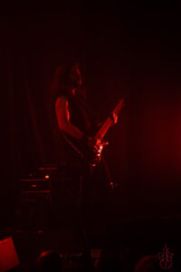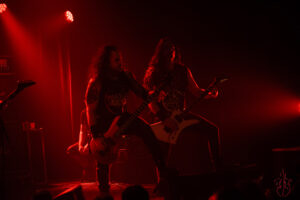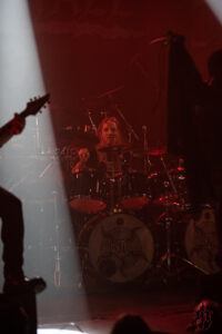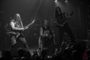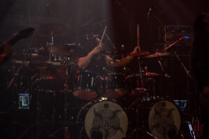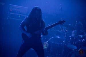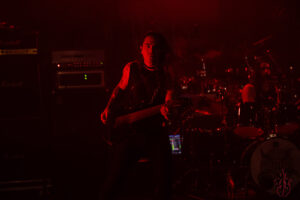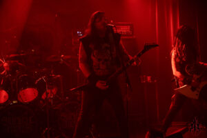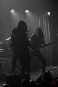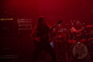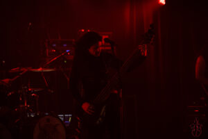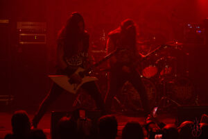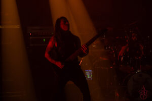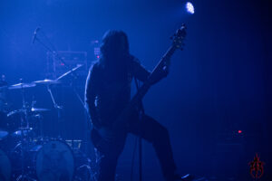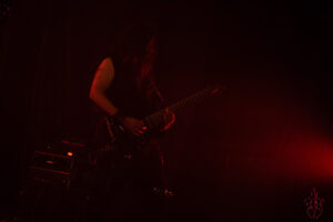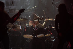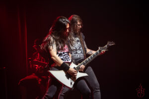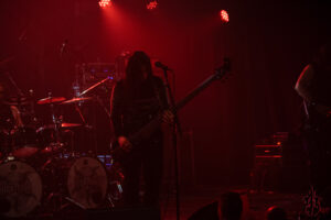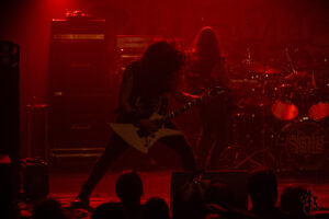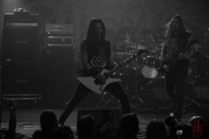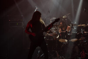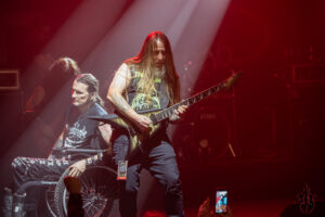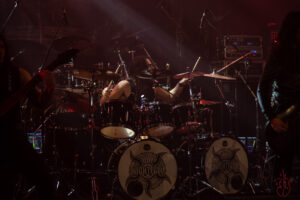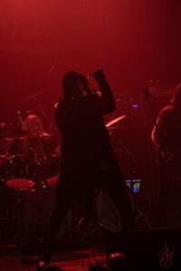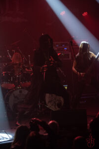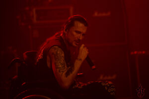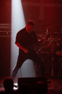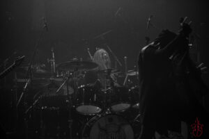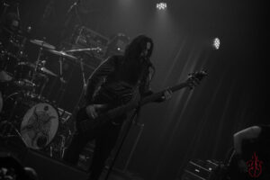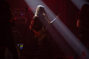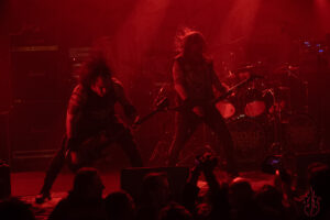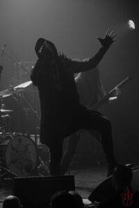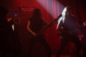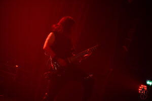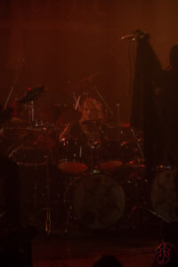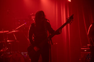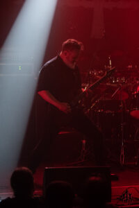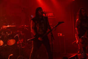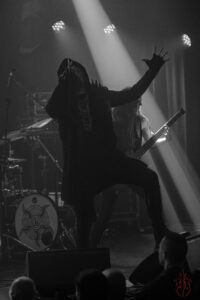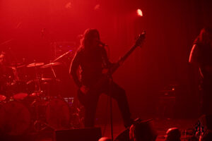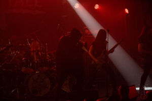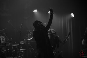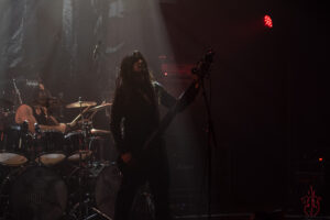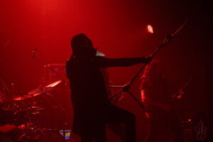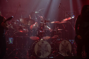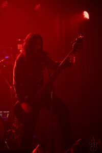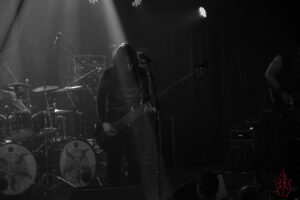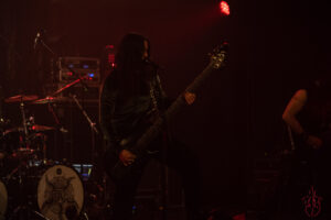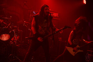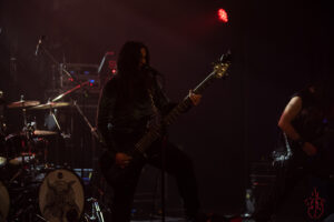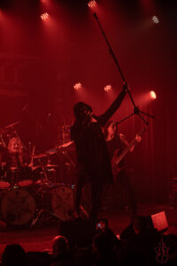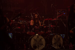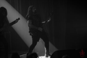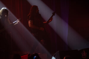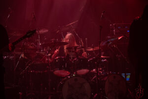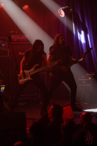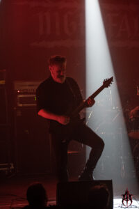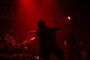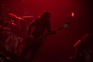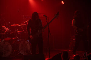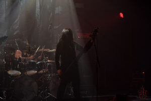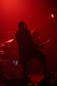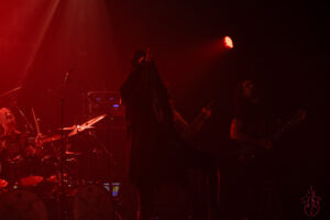 Dès les premiers titres, le groupe impose une coordination millimétrée : headbangs synchronisés, passages majestueux où les musiciens lèvent les bras comme pour invoquer quelque chose de plus sombre encore. Les deux premiers morceaux baignent dans un rouge profond, renforçant l’aspect ritualiste du set.