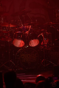A Jaws-style intro signals the arrival of Suicidal Angels. The band takes the stage under red-drenched lights.