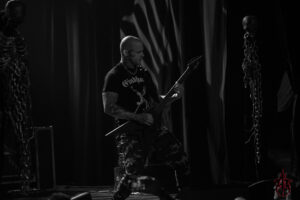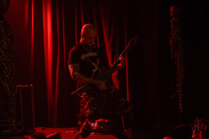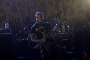 Un pied de micro orné d’un squelette et de chaînes trône sur scène : pas de doute, Terrorizer arrive. Dès l’intro, la fosse est en fusion. Le premier titre est ultra-violent. Brian Werner, le visage recouvert de peinture sombre, est déchaîné, cramponné à son pied de micro.