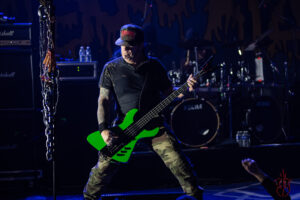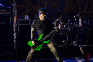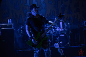 The mic stand is gradually destroyed, pieces handed to techs along with skull props lining the stage. The band pays tribute to Jesse Pintado, drawing a loud round of applause.