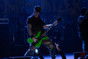 Jeff sourit, grimace, lance des horns, se déplace autant qu’il le peut, visiblement heureux d’être là. Rob Cardenas lève sa basse à la fin des morceaux, tandis que Jeff ponctue le set de murmures étranges entre les titres.