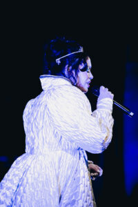 Quand la DJ monte sur scène, la salle est maintenant bien remplie, compacte, vibrante. Une intro instrumentale se lance, la tension monte… et Princess Nokia débarque sous les hurlements du public. Couronne sur la tête, robe de reine, elle arrive comme ce qu’elle est : une souveraine. “Hello Paris !” et le Trianon explose.