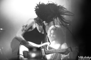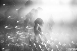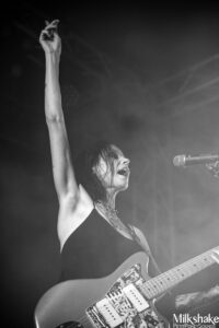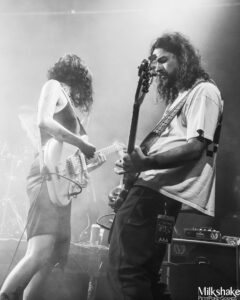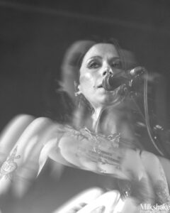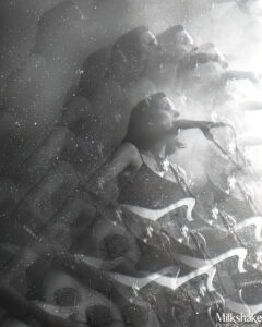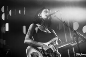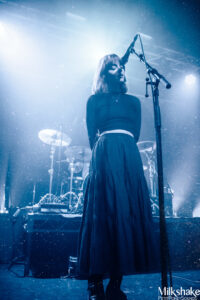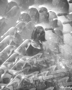 The show opens with She’s Green. The singer, delicate, tambourine in hand, immediately sets a shoegaze atmosphere. Her hazy voice drifts across songs whose endings lean fully into classic shoegaze territory.