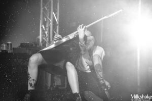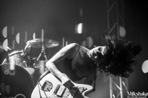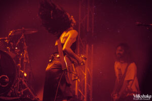 Avec 16/25, dont le thème (grooming) correspond complètement à l’ethos du groupe, l’intensité augmente encore. « This one goes hard ». Phoenix est unstoppable. L’ambiance se calme un peu avec Love Song, suivi de Heaven, où l’on a même le droit d’entendre la belle voix de Phoenix mise en avant. Puis vient Uzumaki, un classique. Le final est un grand moment de musique, avec screams et acrobatics de la chanteuse. Take It Off rallume immédiatement l’énergie : le public s’enflamme de nouveau. Le concert se conclut avec BWBB, qu’on ne présente plus. Mercedes s’exprime pour la cause palestinienne, rappelant le caractère engagé du groupe. « Goes hard af ». Softcult se bat contre le sexisme, l’homophobie, le racisme, la misogynie… le tout avec du répondant, de la colère, une dose de rébellion face au système, des fuzzy guitares, de la reverb, de la grosse disto, et des dreamy tunes.