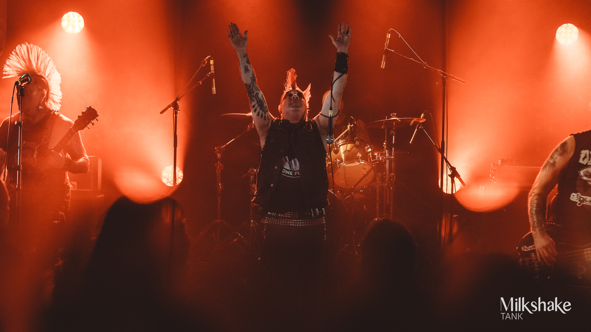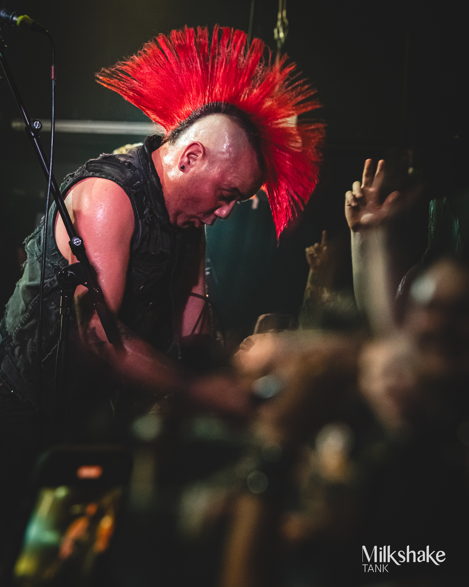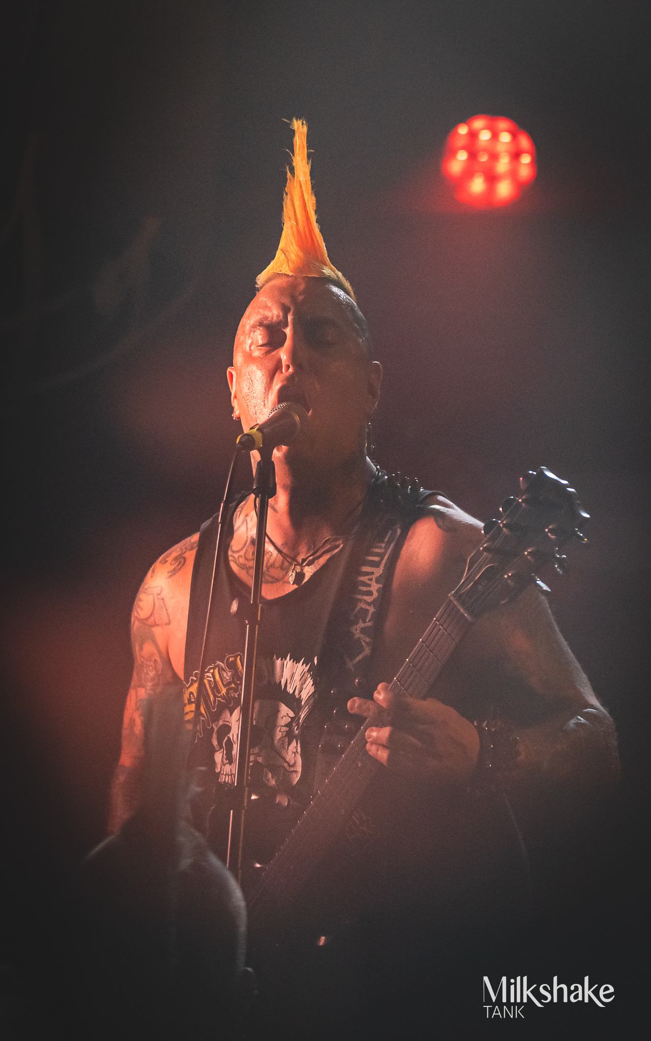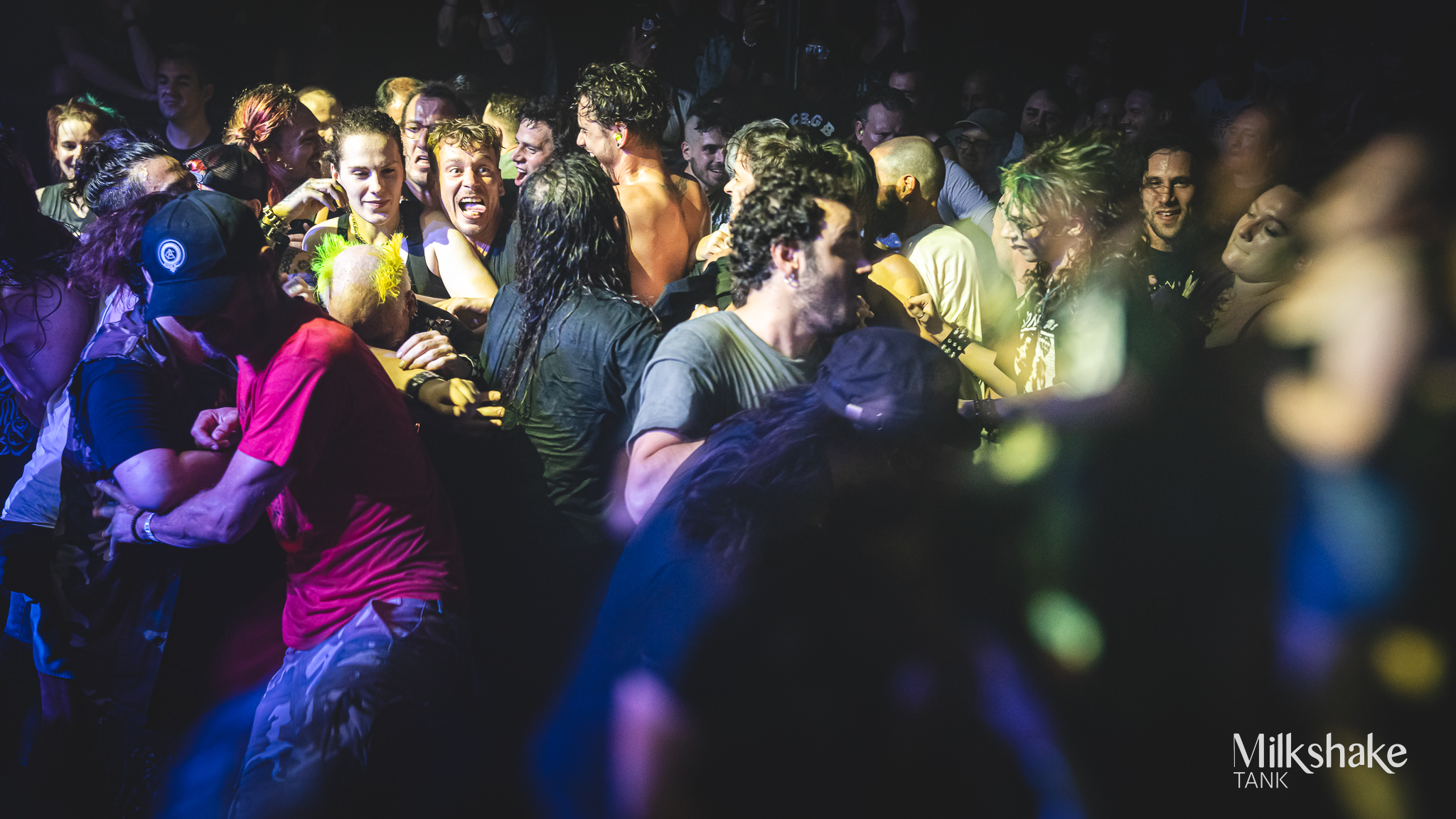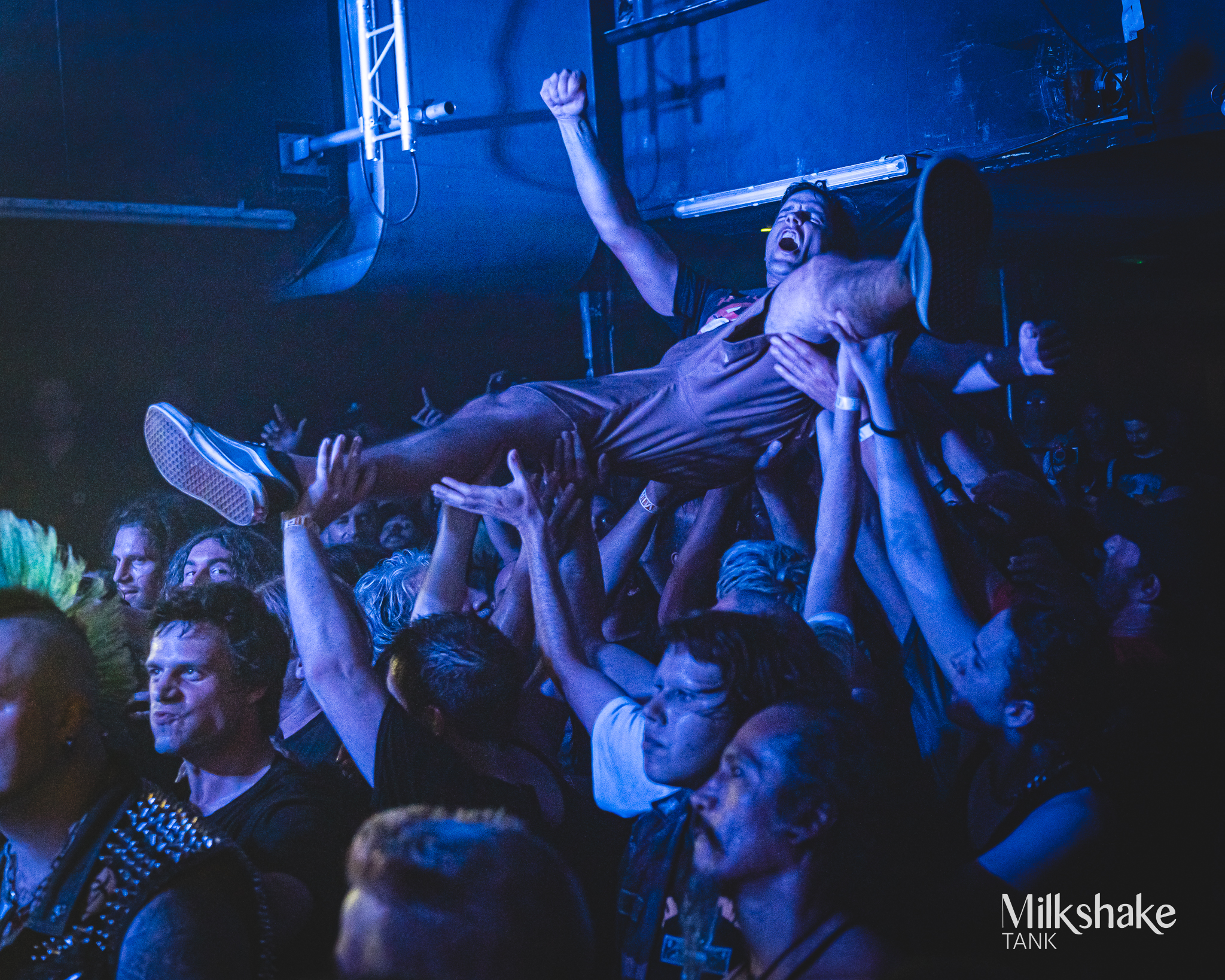 During “Stronger,” the guitarist Yacko was sweating so much that it was a wonder how he didn’t lose his pick, and Cédric dedicated the song to The Casualties and all the punks, diving into the mosh pit once again. For “Blablast,” Cédric urged the audience to go wild. The singer of The Casualties, David, was on the side, taking in the show. With “Join the Night,” Cédric dedicated the song to Manux and his crew, calling for chaos. “Punchline” saw a circle pit initiated by Cédric’s request, and it featured the first crowd surf of the evening.