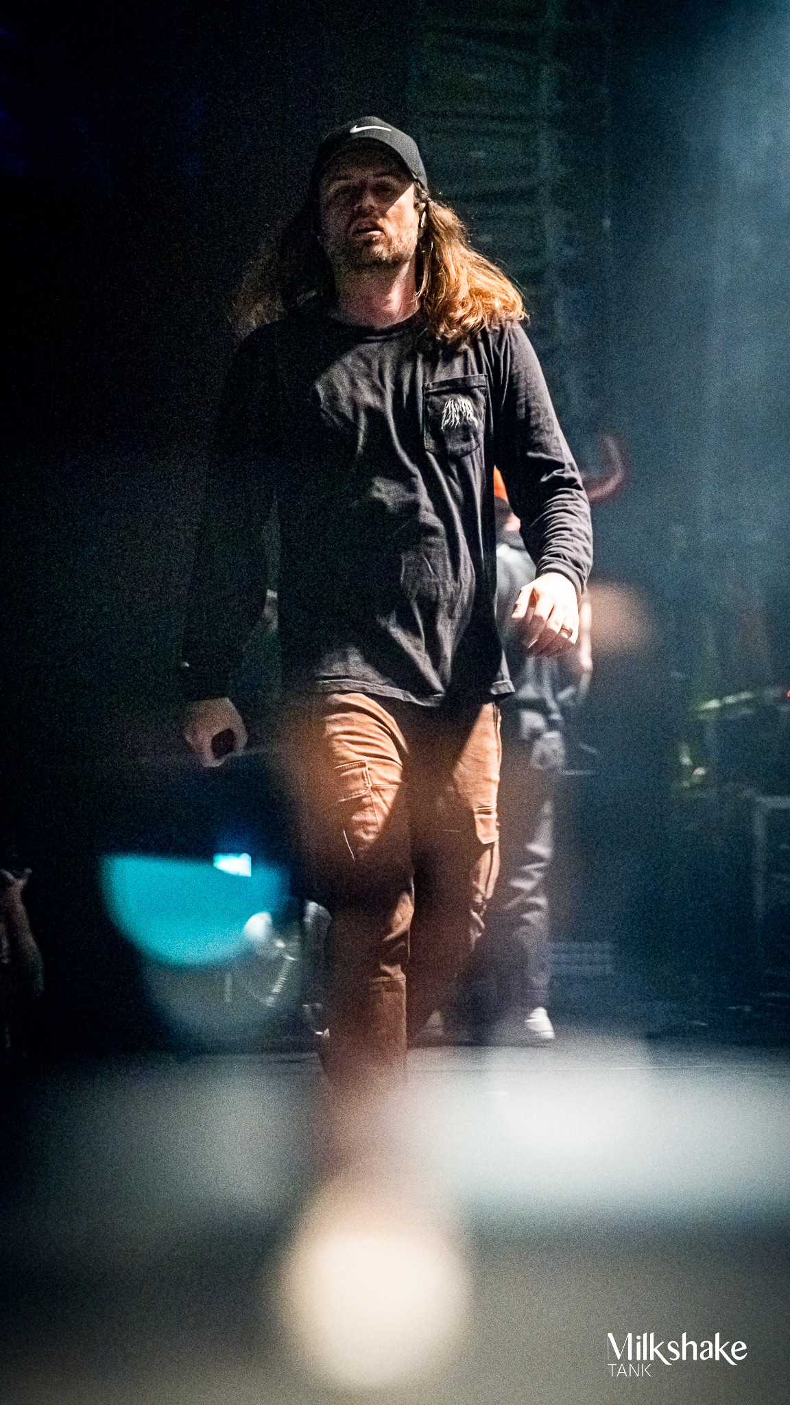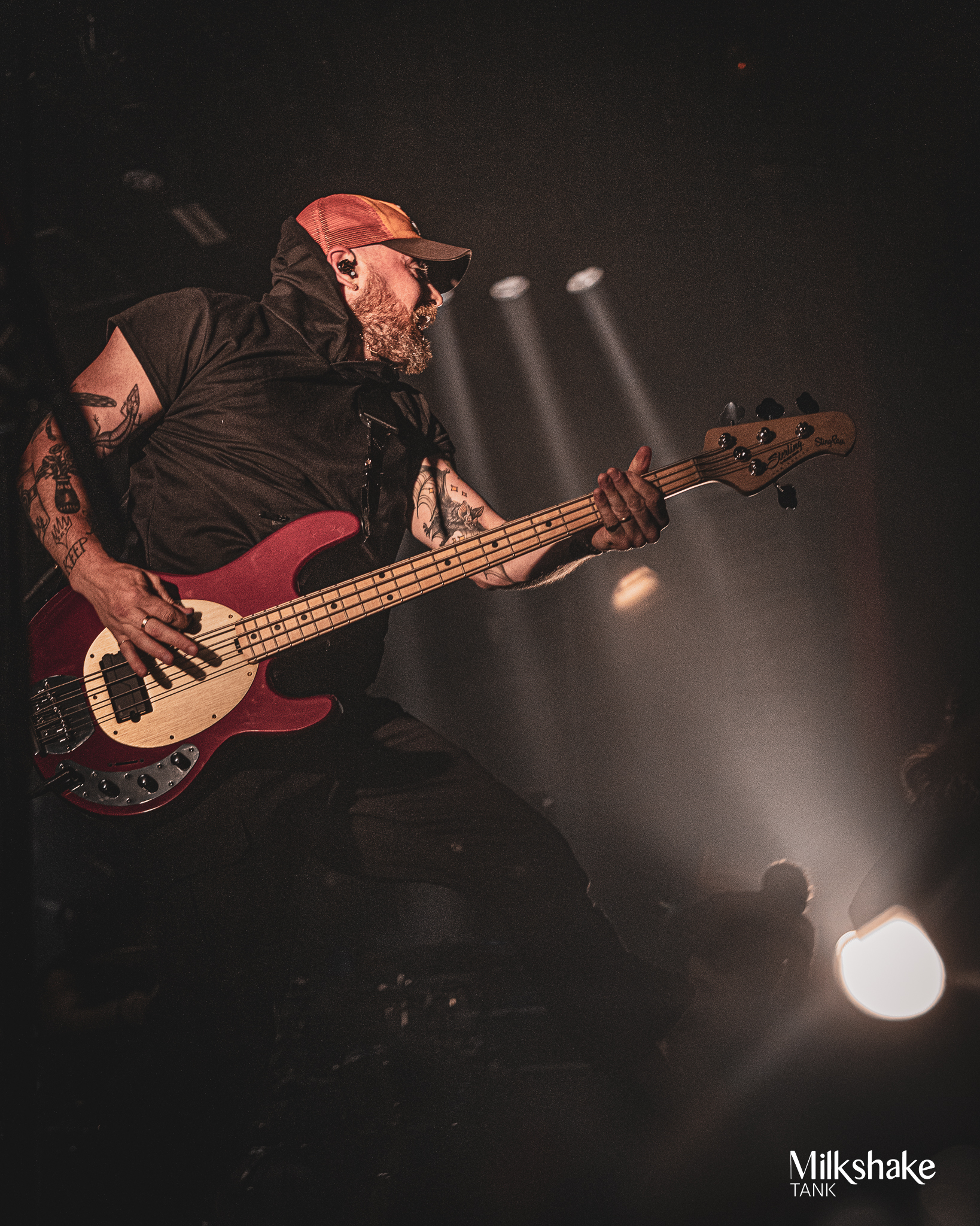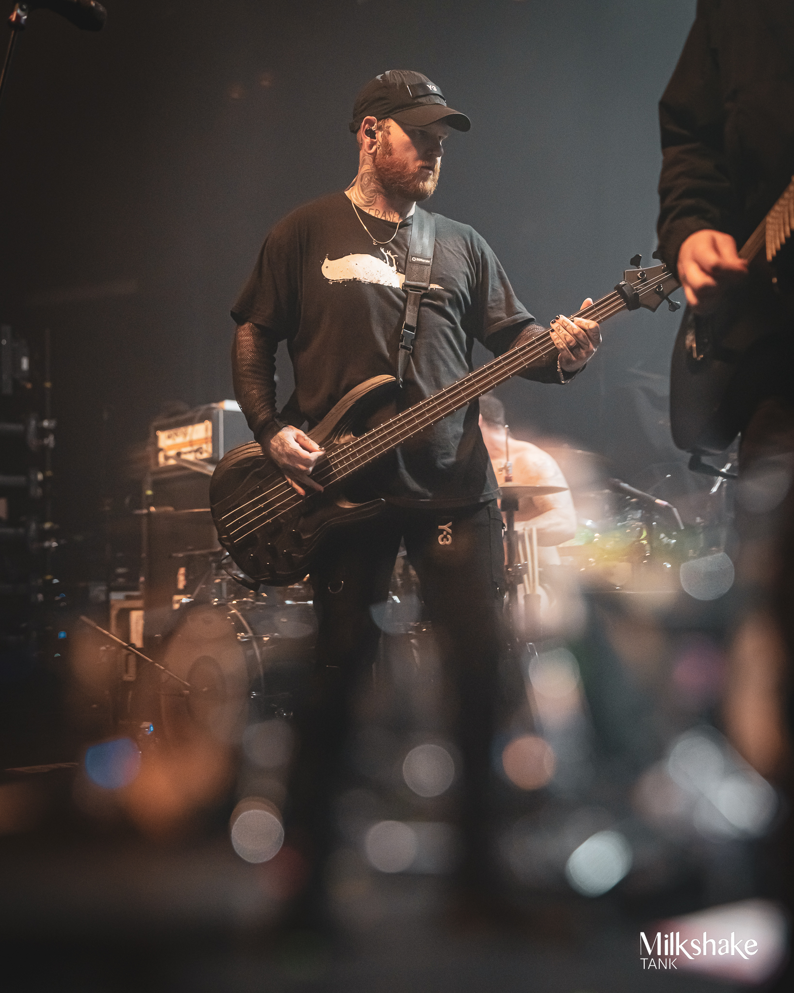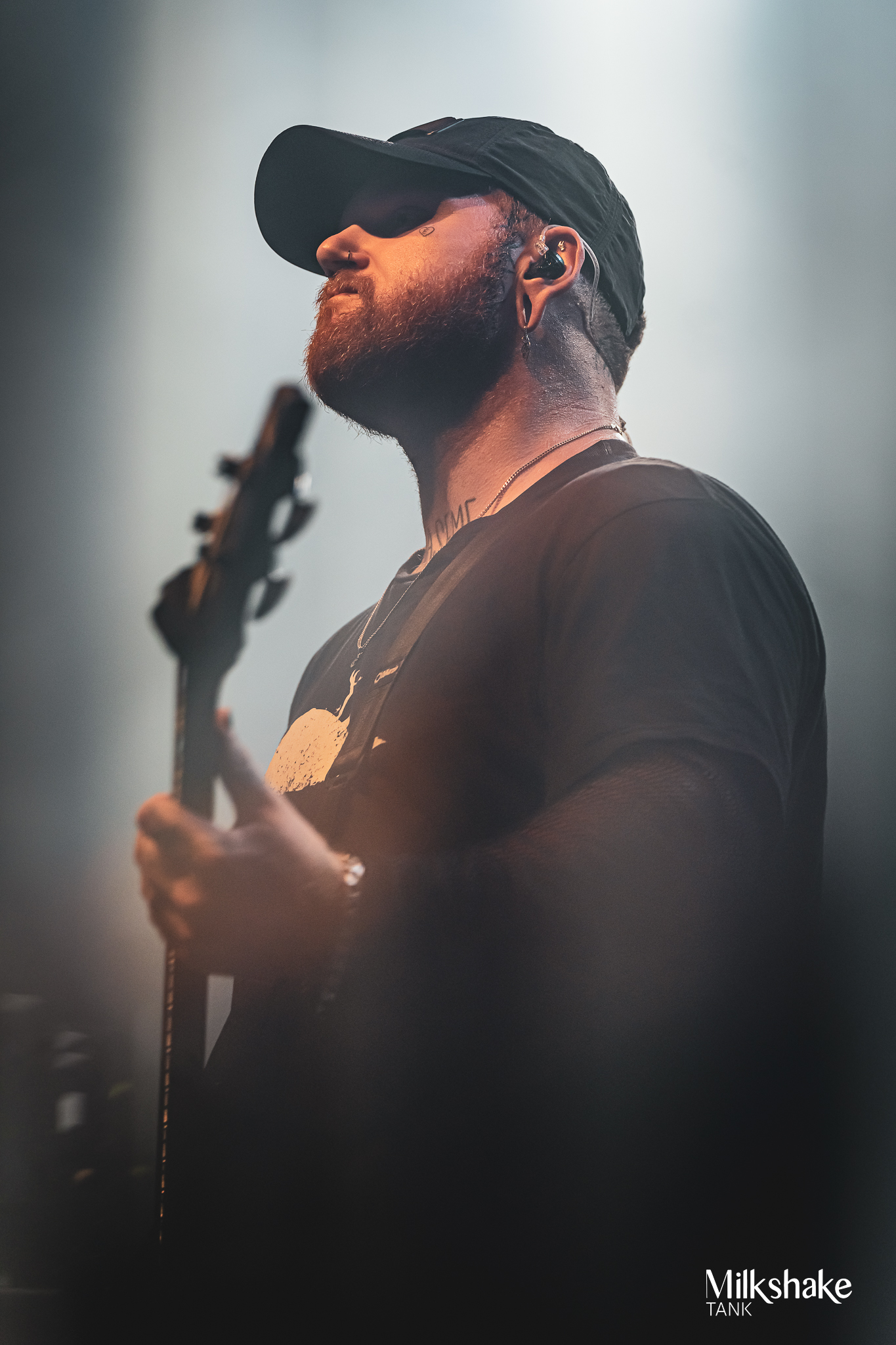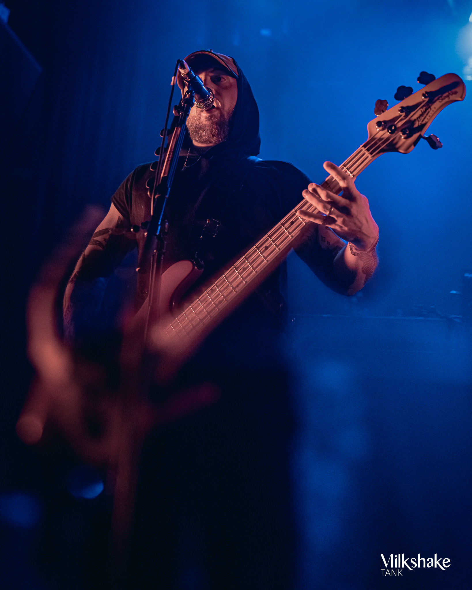 Fit for a King hit the stage with “The Hell We Create“, immediately followed by an explosion of energy. Ryan Kirby, the singer, and Ryan O’Leary, the bassist, who kept spinning his bass around, riled up the crowd, creating frantic circle pits and slams, with the pit going wild. During “Reaper,” Ryan K called for everyone to move and make noise while Ryan O handled the backing vocals. “Backbreaker” triggered another frenzy in the pit, with Ryan Kirby shouting to the back of the room, “Move closer!” The slams multiplied, putting security to the test. Ryan K announced, “Two more songs, everybody scream as loud as you can,” while security seemed overwhelmed by the crowd surfers. Ryan O’Leary shouted, “Make some noise for yourselves and all the bands tonight,” and Ryan K asked if there were any fans of “Band of Sacrifice.” A wall of death was called for and executed amid ongoing slams. The set ended spectacularly with an impressive wall of death and a memorable “blegh.
