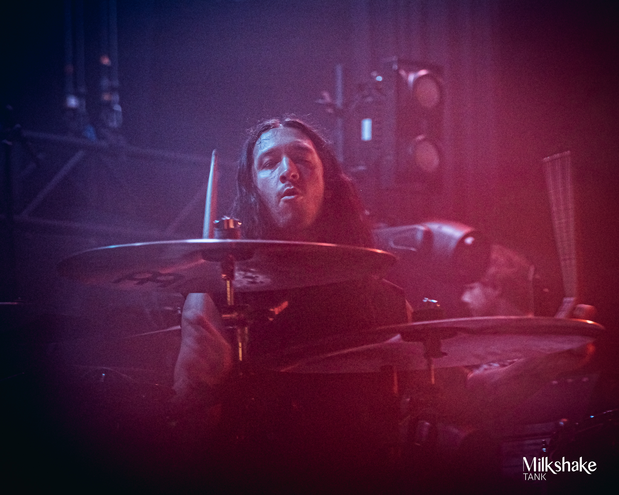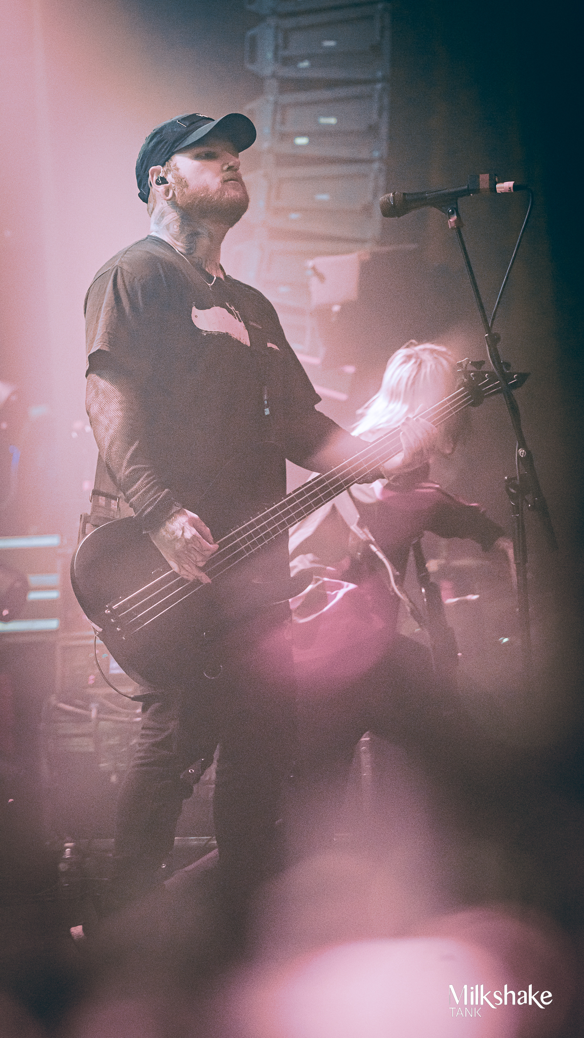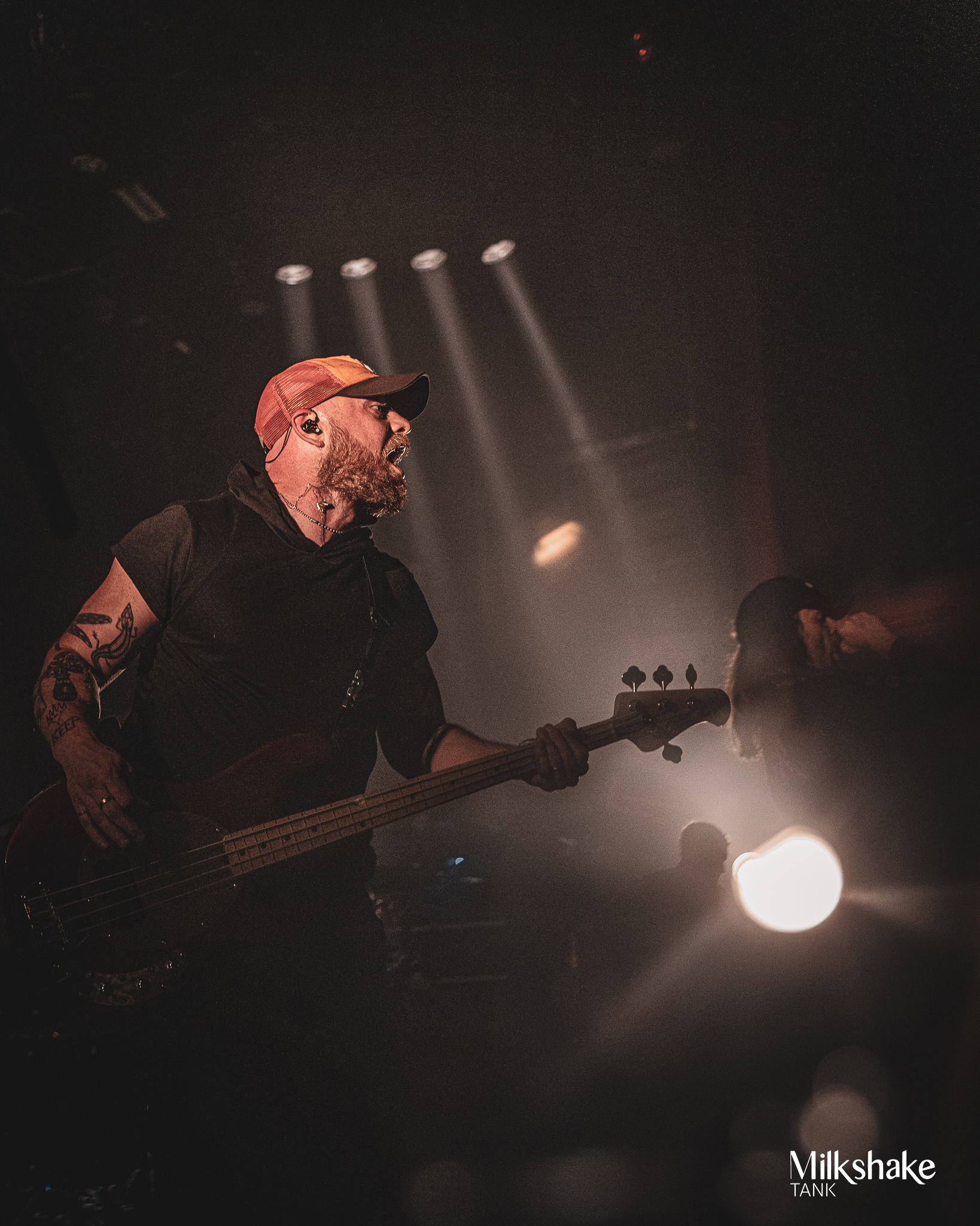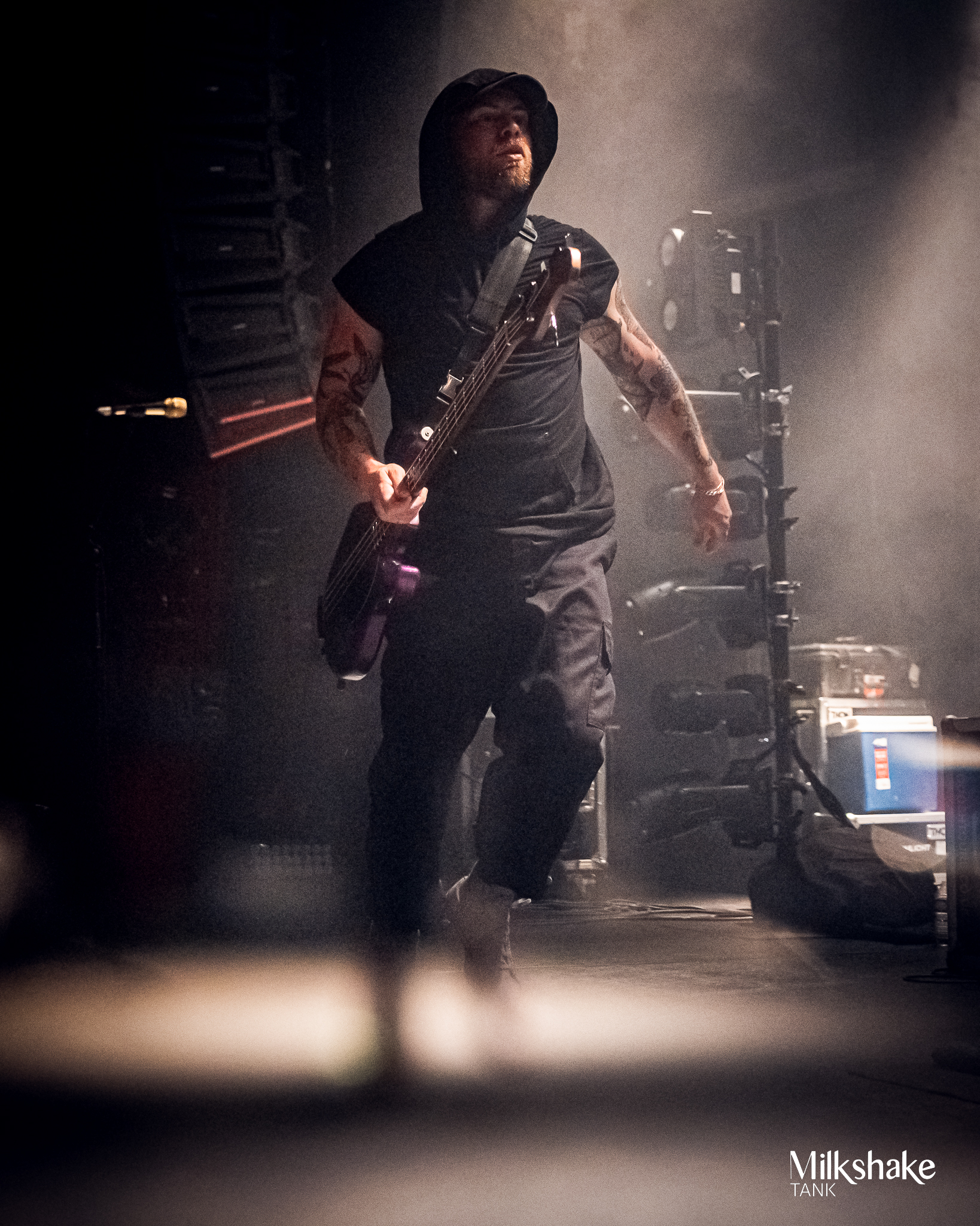 Fit for a King hit the stage with “The Hell We Create“, immediately followed by an explosion of energy. Ryan Kirby, the singer, and Ryan O’Leary, the bassist, who kept spinning his bass around, riled up the crowd, creating frantic circle pits and slams, with the pit going wild. During “Reaper,” Ryan K called for everyone to move and make noise while Ryan O handled the backing vocals. “Backbreaker” triggered another frenzy in the pit, with Ryan Kirby shouting to the back of the room, “Move closer!” The slams multiplied, putting security to the test. Ryan K announced, “Two more songs, everybody scream as loud as you can,” while security seemed overwhelmed by the crowd surfers. Ryan O’Leary shouted, “Make some noise for yourselves and all the bands tonight,” and Ryan K asked if there were any fans of “Band of Sacrifice.” A wall of death was called for and executed amid ongoing slams. The set ended spectacularly with an impressive wall of death and a memorable “blegh.