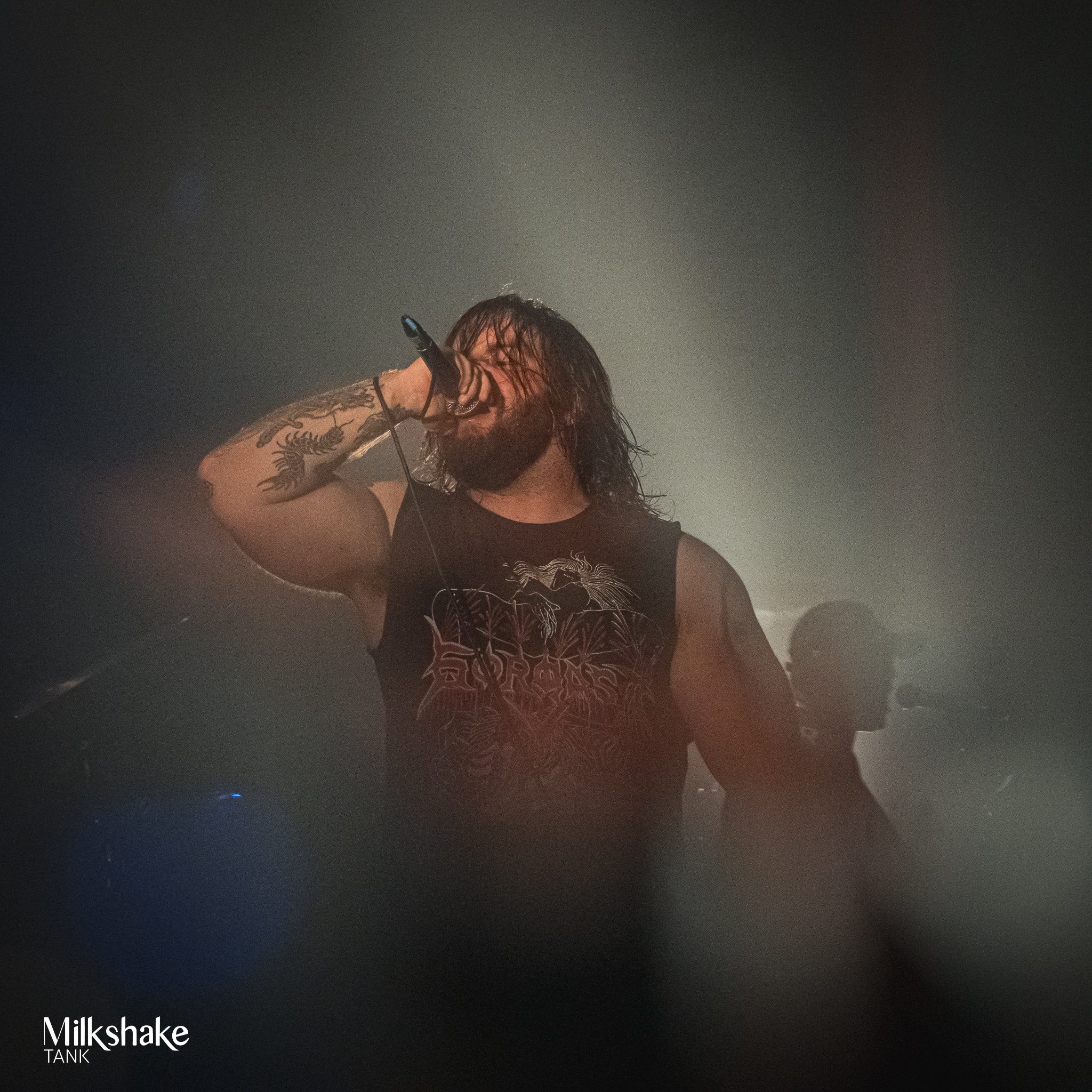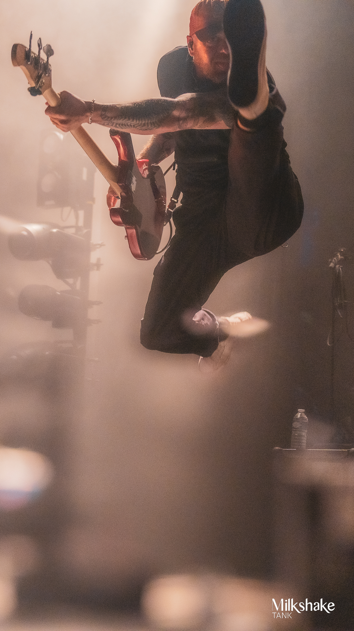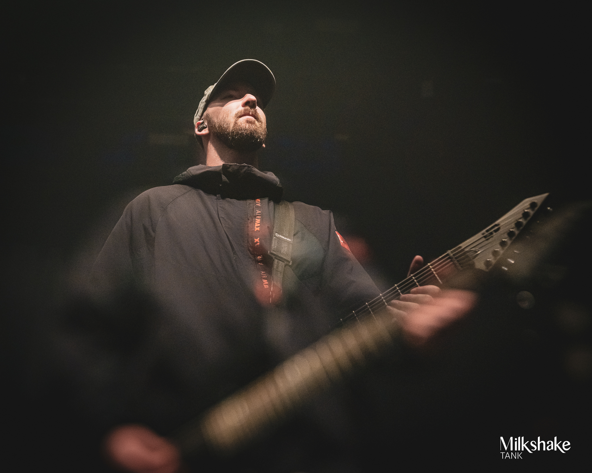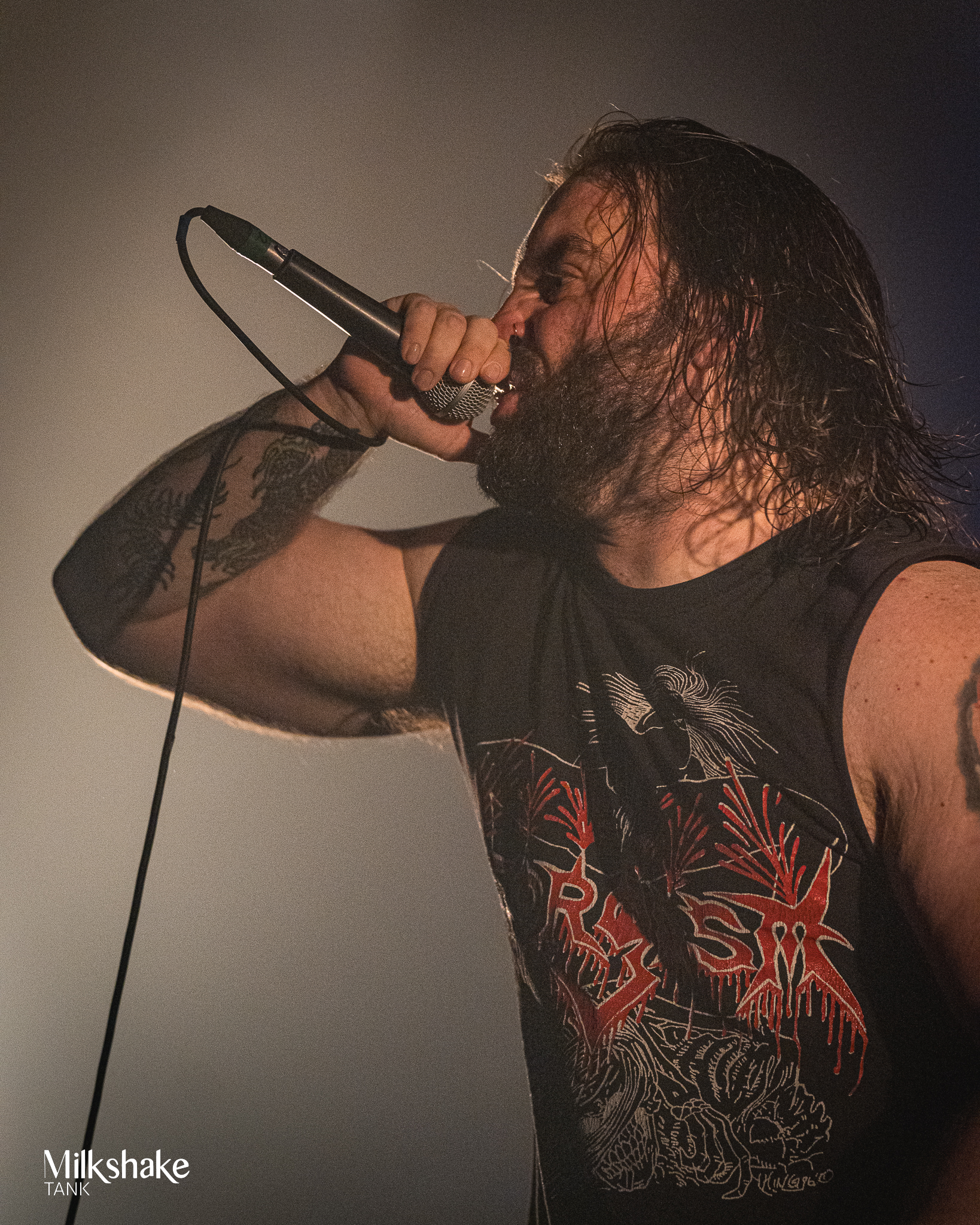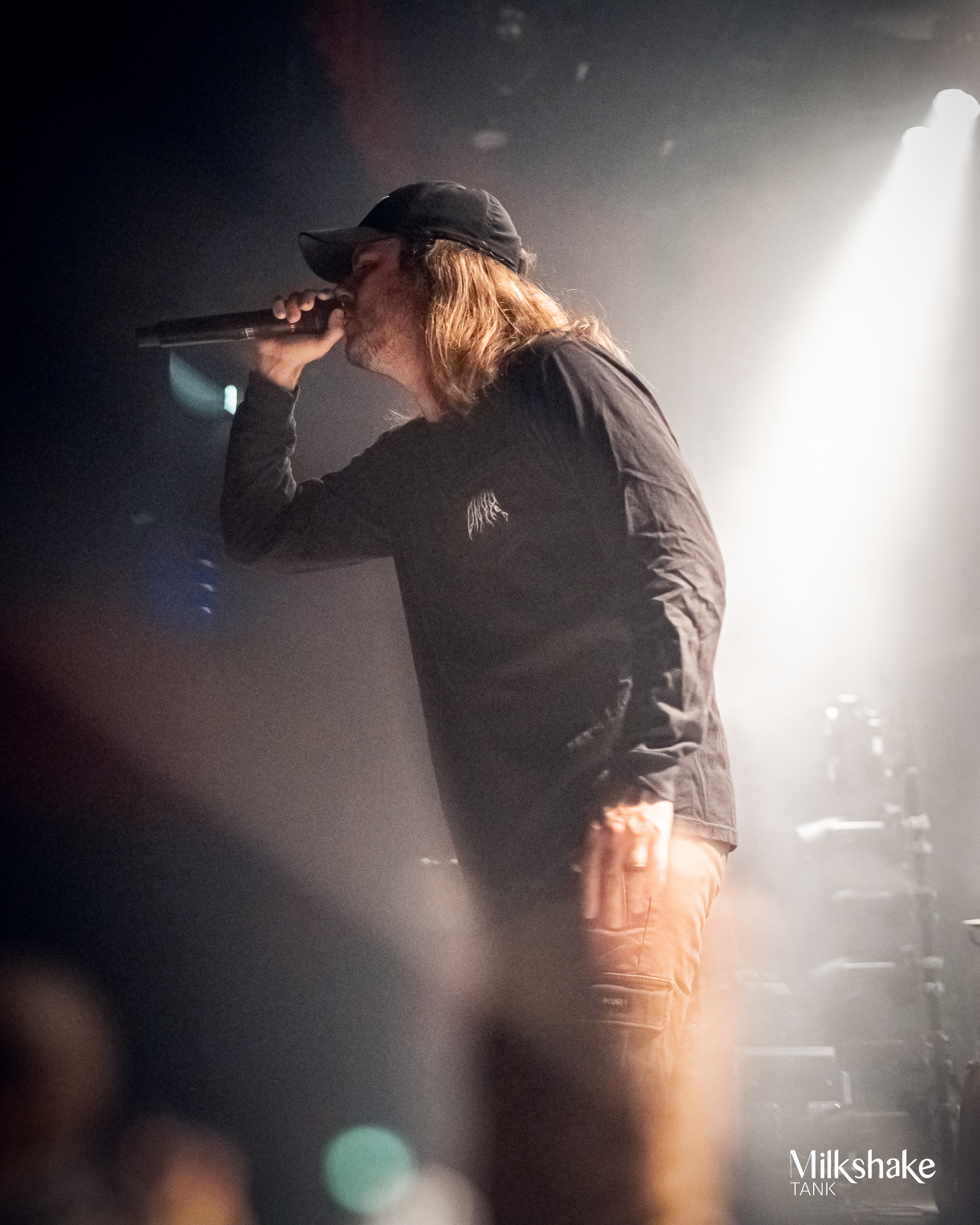 Fit for a King hit the stage with “The Hell We Create“, immediately followed by an explosion of energy. Ryan Kirby, the singer, and Ryan O’Leary, the bassist, who kept spinning his bass around, riled up the crowd, creating frantic circle pits and slams, with the pit going wild. During “Reaper,” Ryan K called for everyone to move and make noise while Ryan O handled the backing vocals. “Backbreaker” triggered another frenzy in the pit, with Ryan Kirby shouting to the back of the room, “Move closer!” The slams multiplied, putting security to the test. Ryan K announced, “Two more songs, everybody scream as loud as you can,” while security seemed overwhelmed by the crowd surfers. Ryan O’Leary shouted, “Make some noise for yourselves and all the bands tonight,” and Ryan K asked if there were any fans of “Band of Sacrifice.” A wall of death was called for and executed amid ongoing slams. The set ended spectacularly with an impressive wall of death and a memorable “blegh.