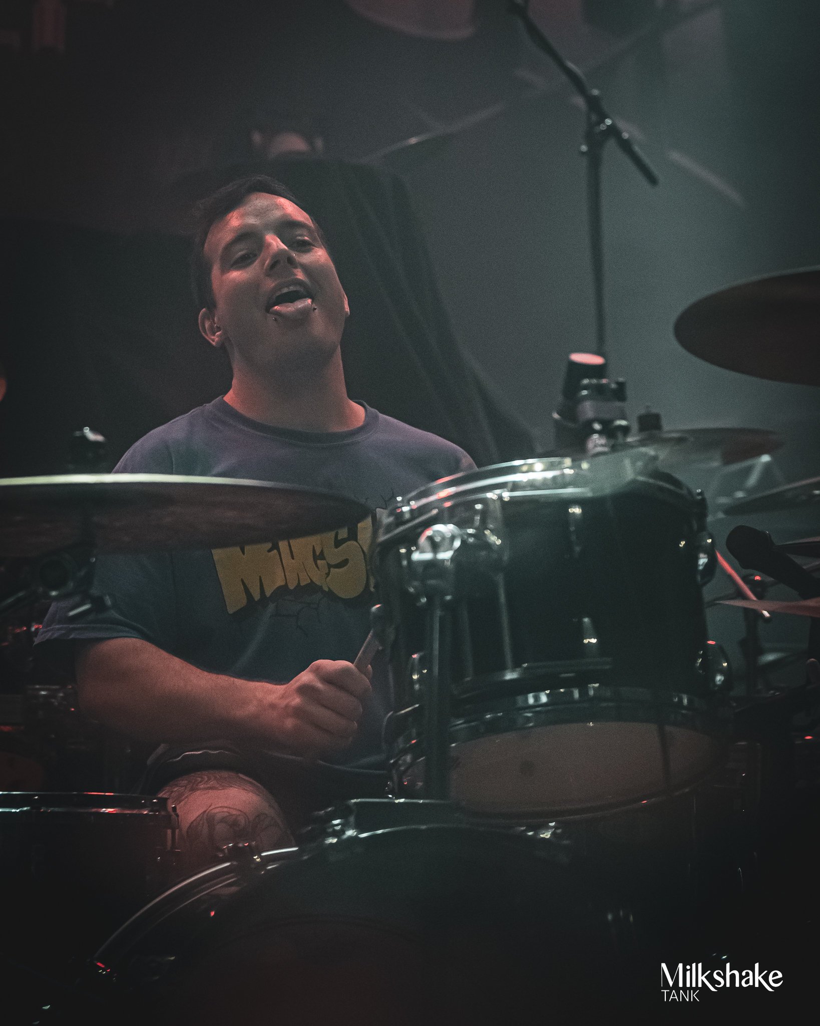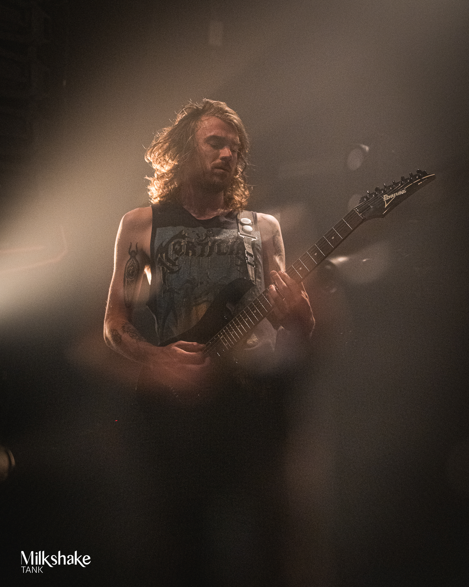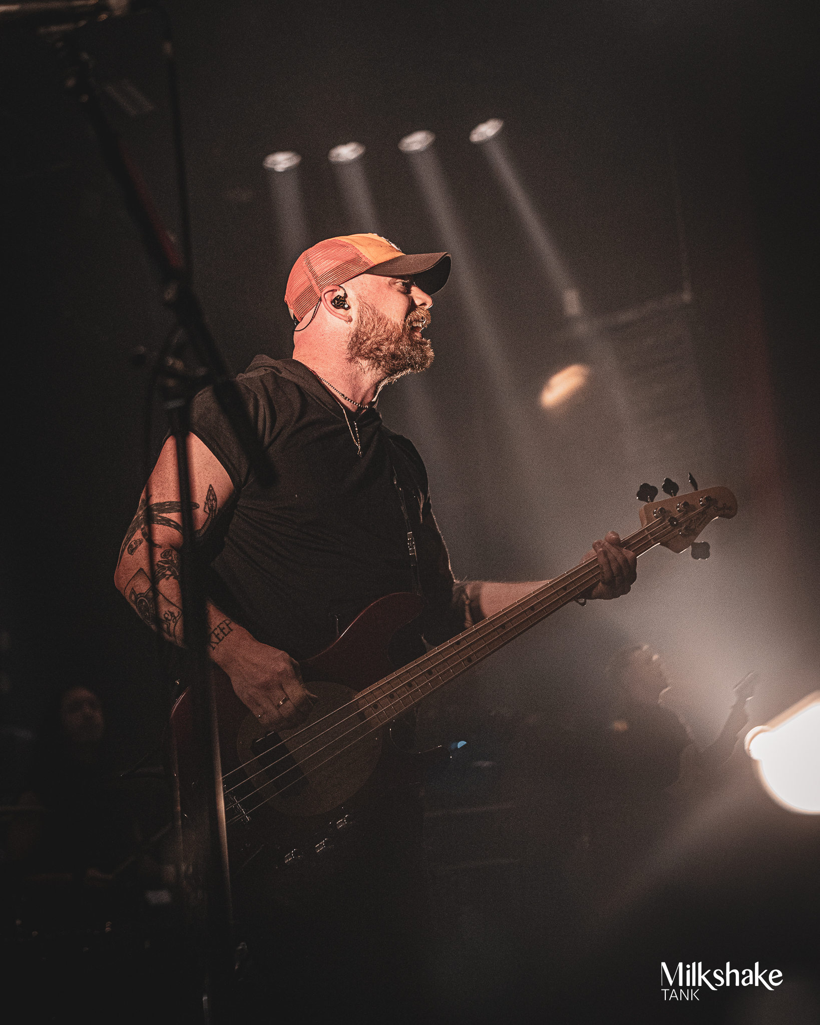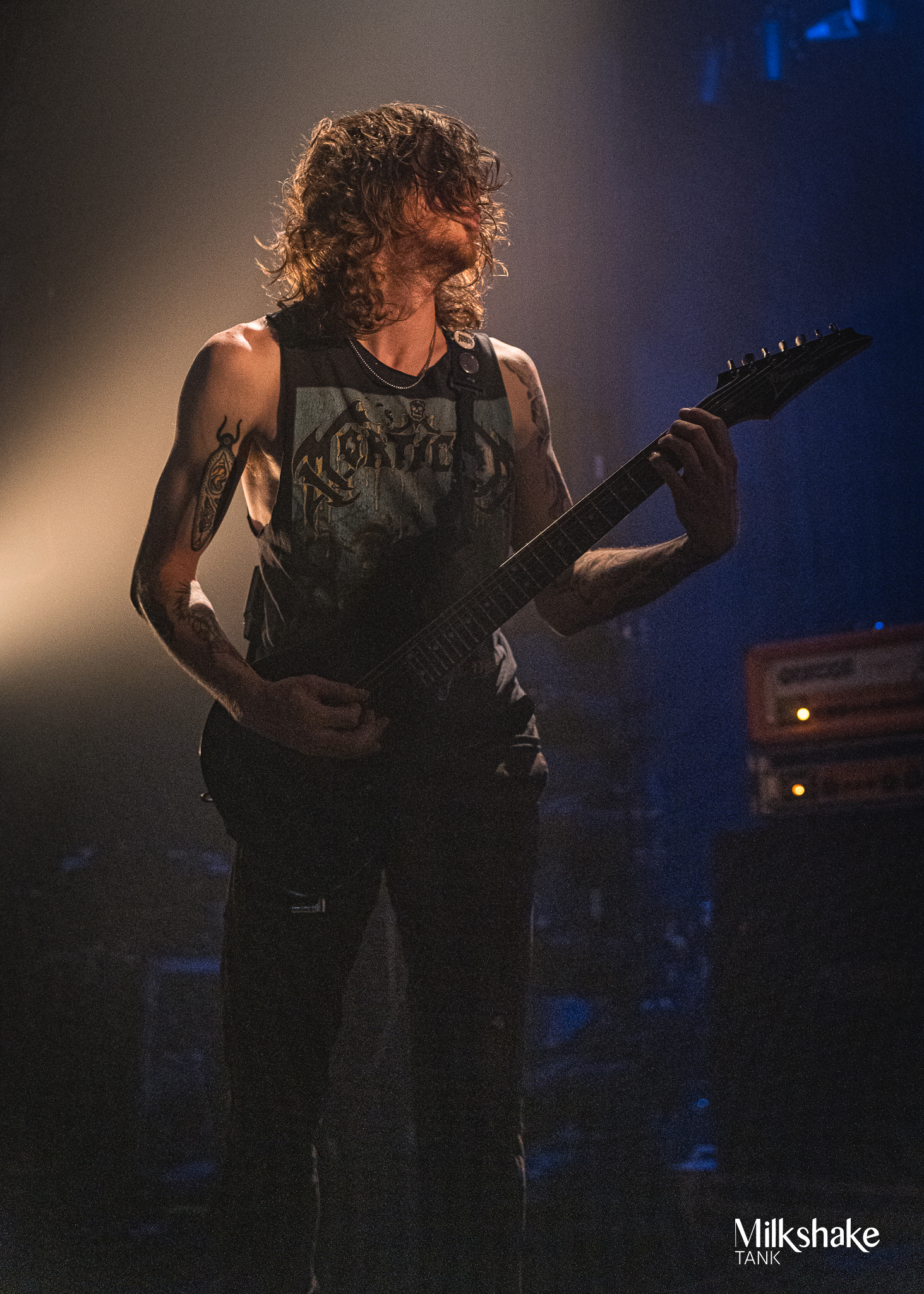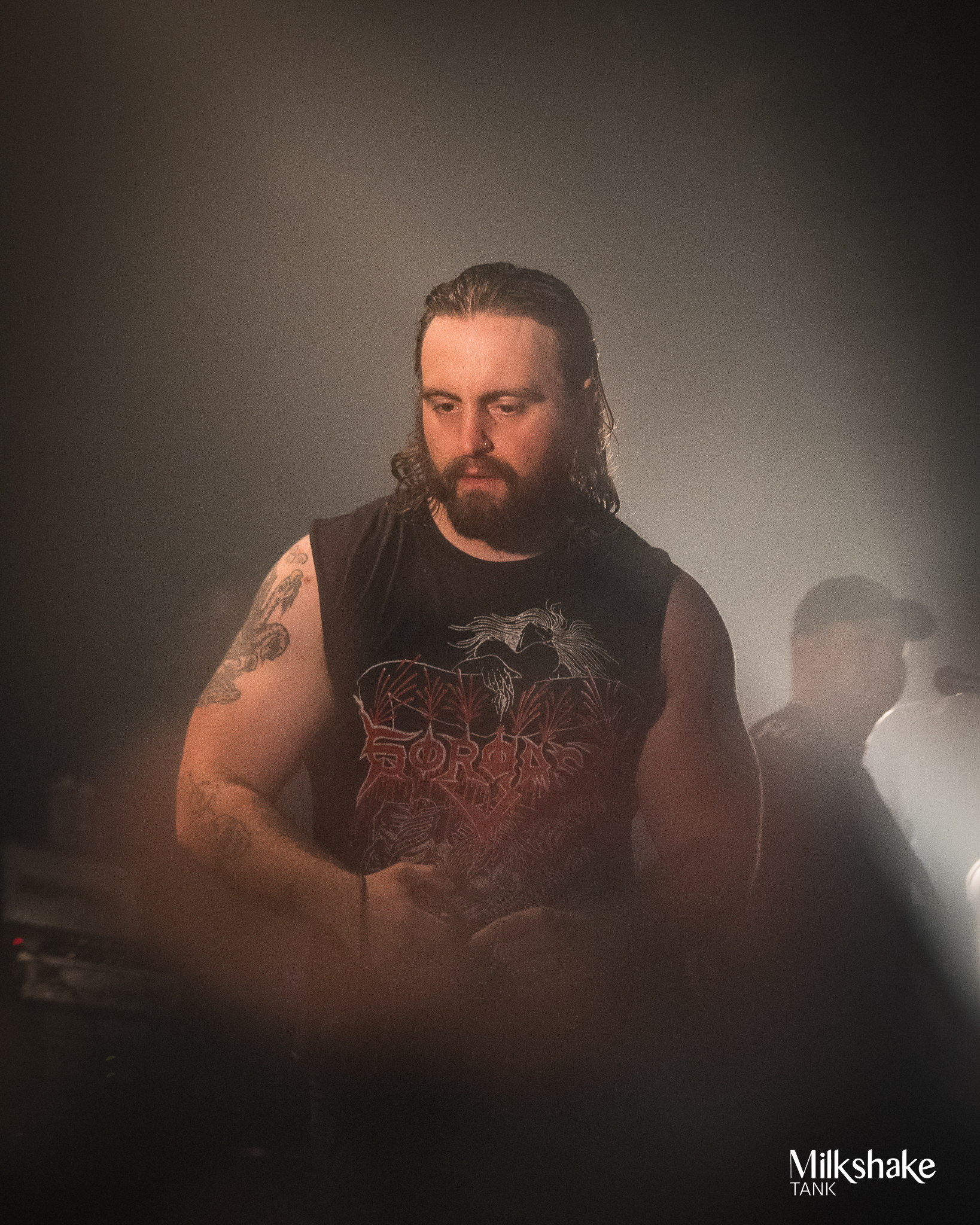 Fit for a King hit the stage with “The Hell We Create“, immediately followed by an explosion of energy. Ryan Kirby, the singer, and Ryan O’Leary, the bassist, who kept spinning his bass around, riled up the crowd, creating frantic circle pits and slams, with the pit going wild. During “Reaper,” Ryan K called for everyone to move and make noise while Ryan O handled the backing vocals. “Backbreaker” triggered another frenzy in the pit, with Ryan Kirby shouting to the back of the room, “Move closer!” The slams multiplied, putting security to the test. Ryan K announced, “Two more songs, everybody scream as loud as you can,” while security seemed overwhelmed by the crowd surfers. Ryan O’Leary shouted, “Make some noise for yourselves and all the bands tonight,” and Ryan K asked if there were any fans of “Band of Sacrifice.” A wall of death was called for and executed amid ongoing slams. The set ended spectacularly with an impressive wall of death and a memorable “blegh.