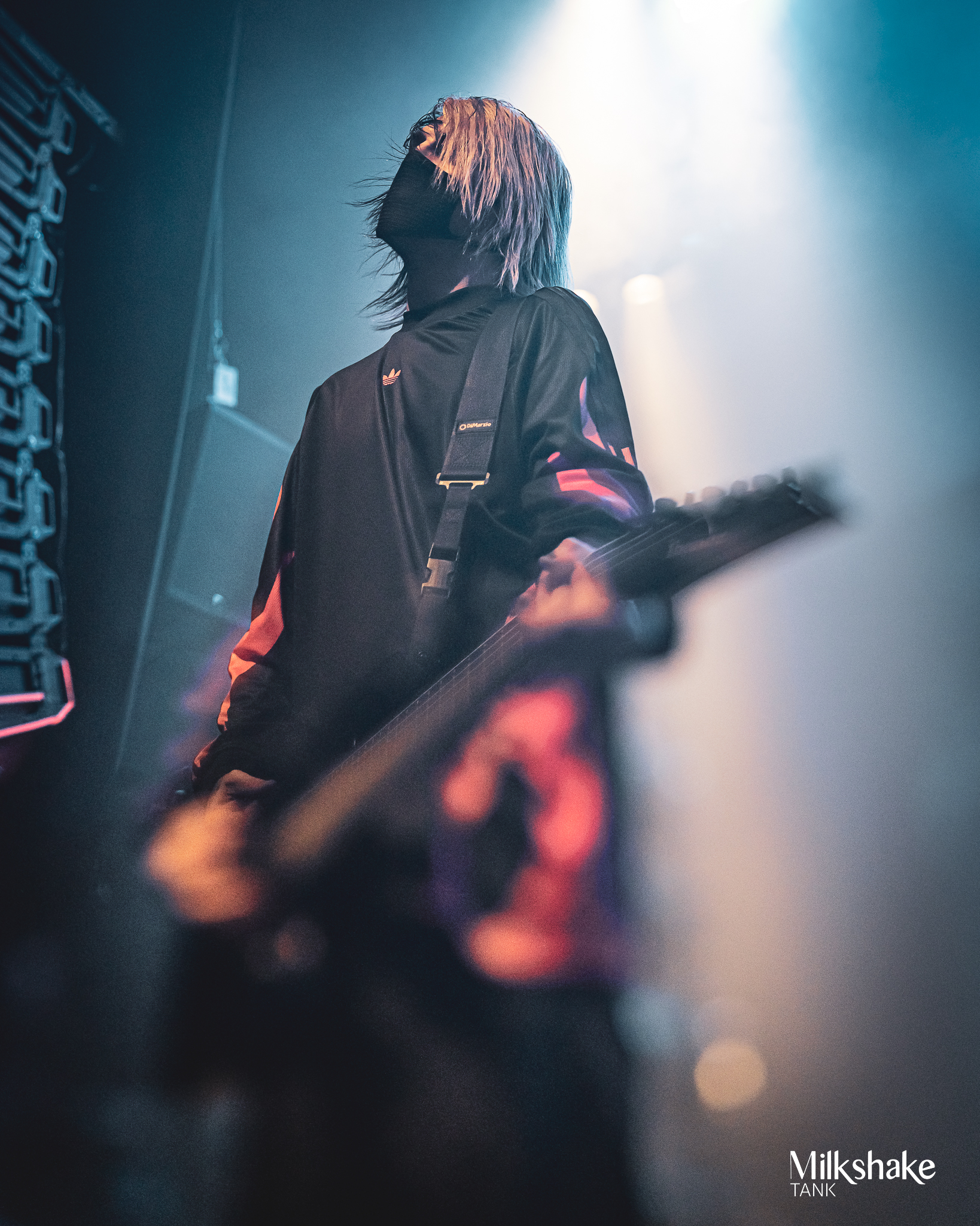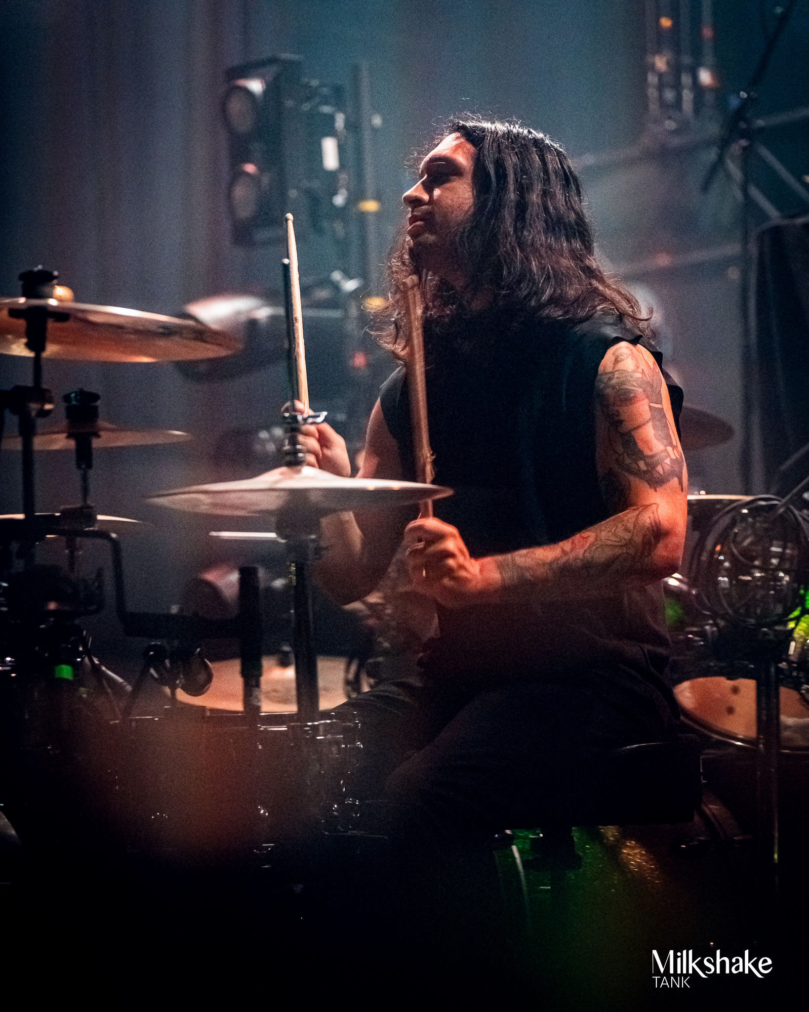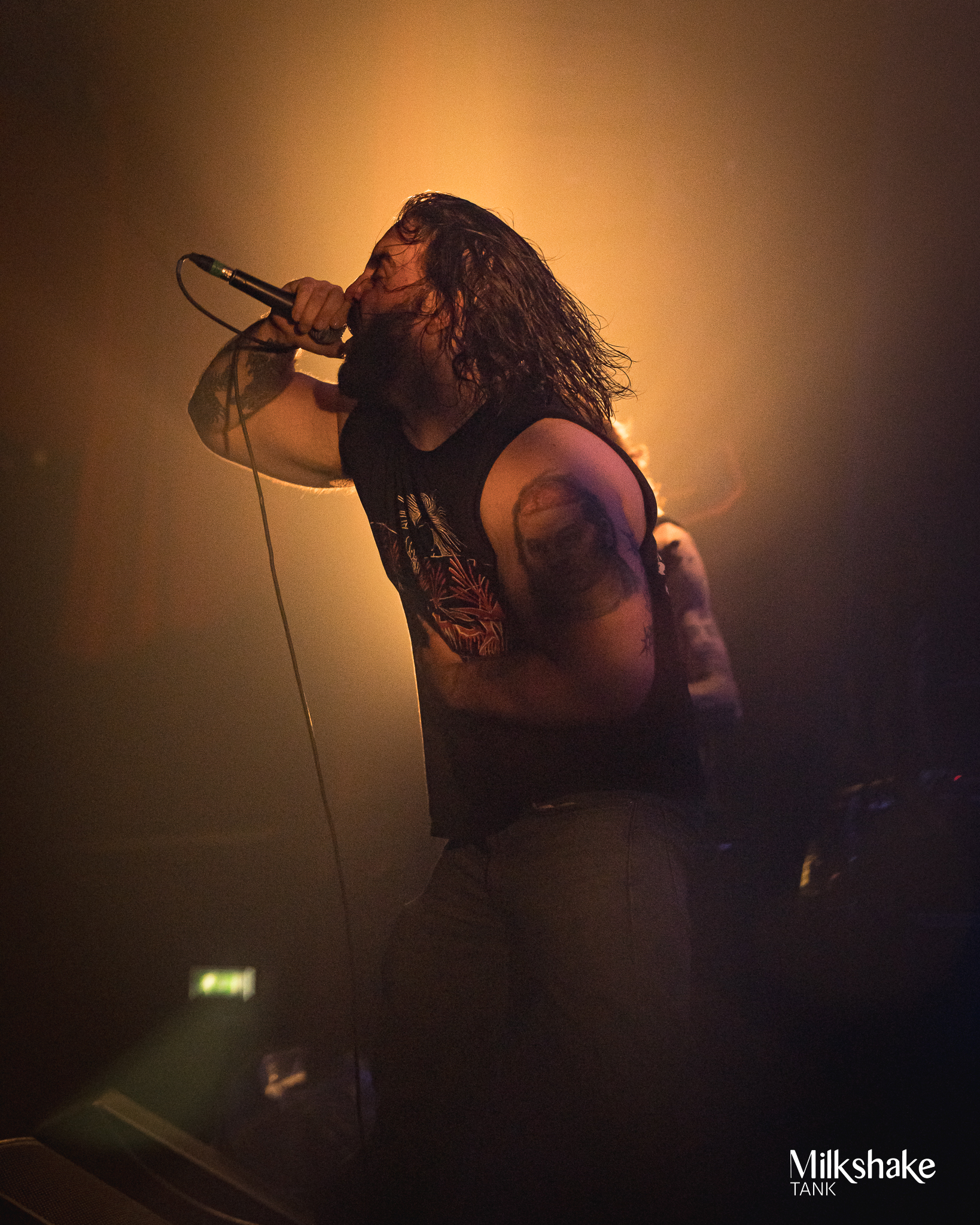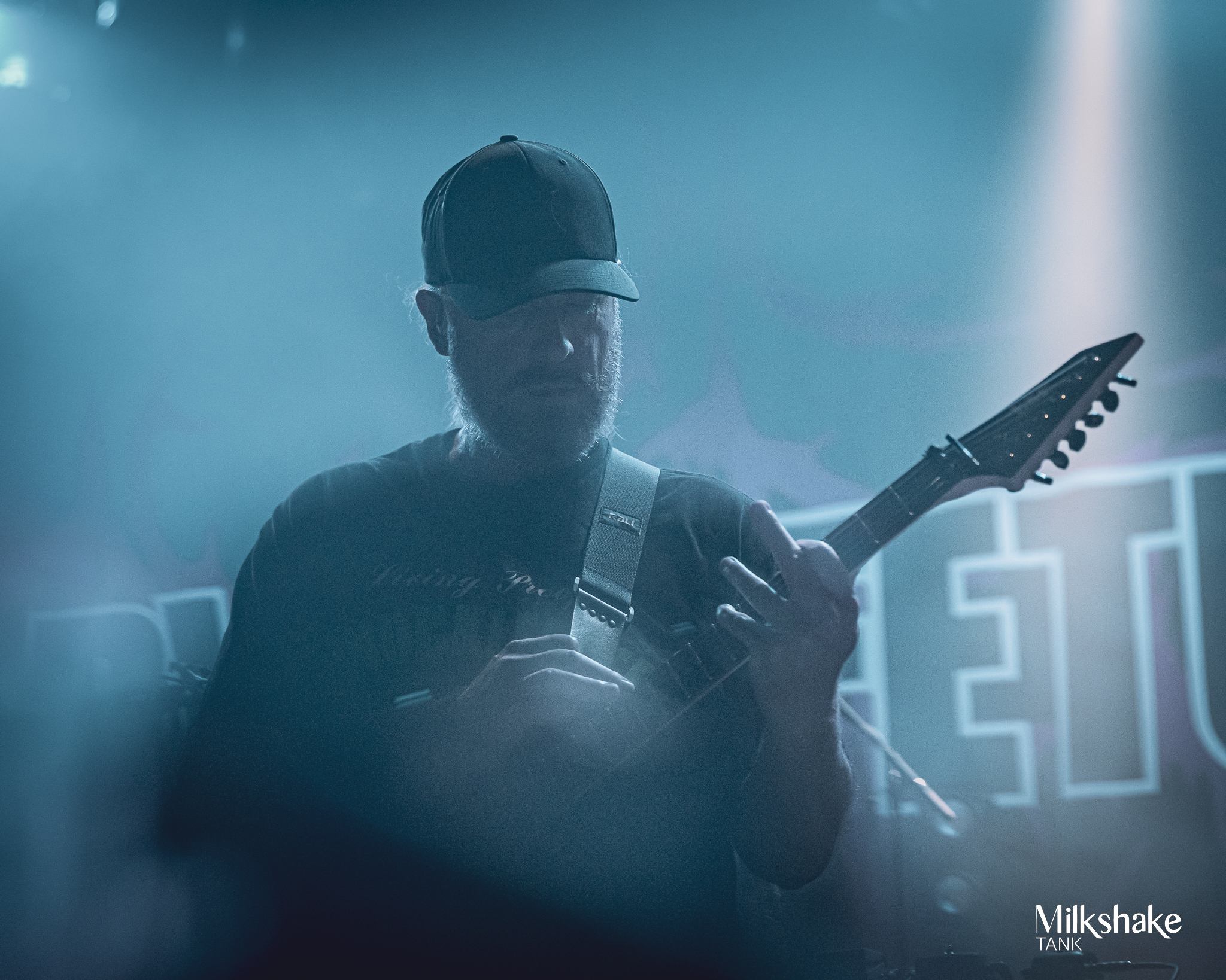 Fit for a King hit the stage with “The Hell We Create“, immediately followed by an explosion of energy. Ryan Kirby, the singer, and Ryan O’Leary, the bassist, who kept spinning his bass around, riled up the crowd, creating frantic circle pits and slams, with the pit going wild. During “Reaper,” Ryan K called for everyone to move and make noise while Ryan O handled the backing vocals. “Backbreaker” triggered another frenzy in the pit, with Ryan Kirby shouting to the back of the room, “Move closer!” The slams multiplied, putting security to the test. Ryan K announced, “Two more songs, everybody scream as loud as you can,” while security seemed overwhelmed by the crowd surfers. Ryan O’Leary shouted, “Make some noise for yourselves and all the bands tonight,” and Ryan K asked if there were any fans of “Band of Sacrifice.” A wall of death was called for and executed amid ongoing slams. The set ended spectacularly with an impressive wall of death and a memorable “blegh.